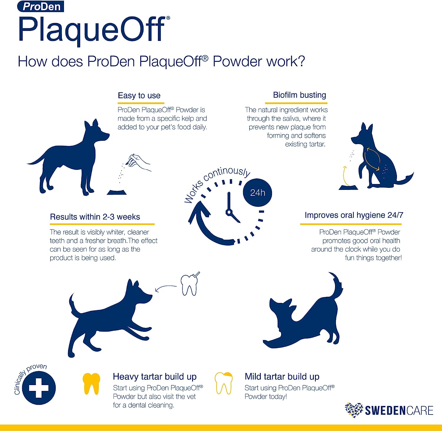Cat & Dog Teeth Cleaning Powder: Palatable ProDen powder is formulated with natural seaweed to help reduce plaque and tartar buildup over time. It's easier than brushing and tastier than toothpaste!10No More Dog Breath: This cat and dog breath freshener helps improve mouth odor over time as it works to reduce plaque. Give your dog fresh breath every day with this tasty supplement10Healthy Mouth for Dogs & Cats: Statistics show that most adult pets have dental issues; help prevent oral issues with a daily dental care supplement your pet will love!10Cat Breath Freshener: Improper cat oral care can lead to not only bad breath but also dental troubles. ProDen is formulated to help reduce plaque and tartar buildup over time in cats of any age10Premium Plaque Off Powder Cat Formula: Designed for feline palates, this tasty food additive powder is made with high-quality ingredients to ensure a safe and effective cat oral health treatment