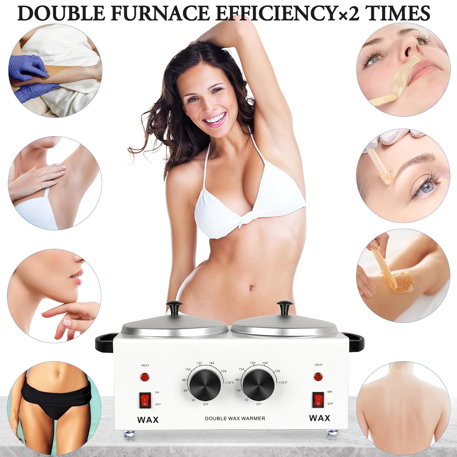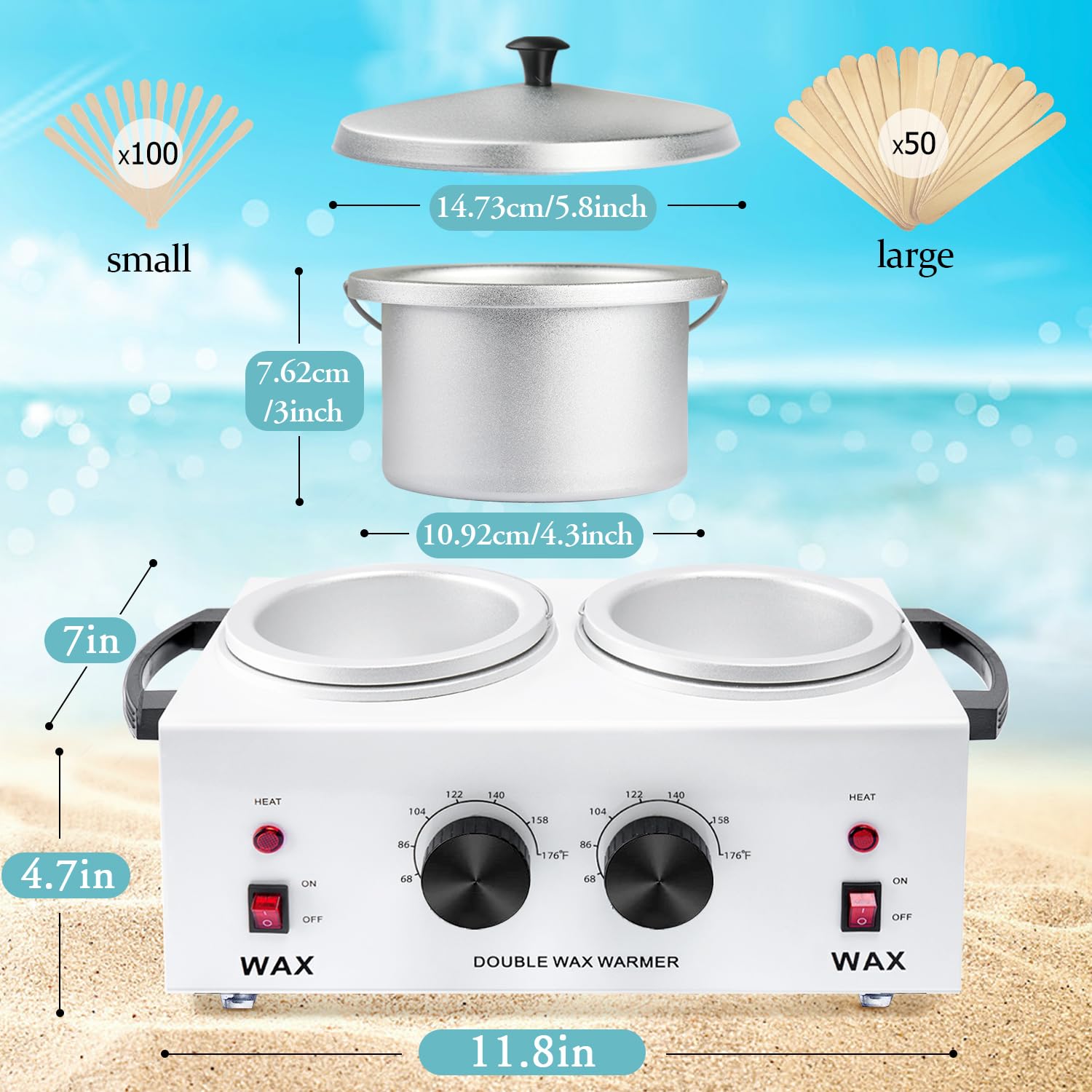 About this item ???Superior Material?Our professional double chamber electric wax warmer is made of a metal construction body and aluminum pot which is durable and heated up quickly, designed to handle all day useādouble pot wax warmers for multiple treatments, or extra large waxing areas. Professional wax warmer for hair removal ???Adjustable Temperature?Upgrade Fahrenheit Dial Wax Heater for Hair Removal 32-176 degrees Fahrenheit, It is easy to read and adjustable. Each of the two sides has independent temperature settings so you can maintain different temperatures on each side. Best wax machine for hair removal ???Reasonable Size?Each wax warmer machine features an industry 4-1/8ā diameter suitable for most wax containers, including the standard 14-ounce size or other same diameter. Double wax warmer pot ???Detachable Double Pots?Each pot has an independent cover, and the pot's inner size is 4.2 inches in diameter, large enough for most standard wax cans. Detachable design is easy for you to clean. 50pcs large wooden sticks and 100pcs small wooden sticks can apply wax to different parts of the body without the need to purchase them separately. Two wax pots can melt two different types of wax at the same time. ???Convenient Design?Dual wax pots design with separate switch and adjustable temperature, easy to use. The indicator light is on when it works, the sides are designed for a natural cooling system, and the bottom has four anti-slip feet. āŗ See more product details,???Superior Material?Our professional double chamber electric wax warmer is made of a metal construction body and aluminum pot which is durable and heated up quickly, designed to handle all day useādouble pot wax warmers for multiple treatments, or extra large waxing areas. Professional wax warmer for hair removal,???Adjustable Temperature?Upgrade Fahrenheit Dial Wax Heater for Hair Removal 32-176 degrees Fahrenheit, It is easy to read and adjustable. Each of the two sides has independent temperature settings so you can maintain different temperatures on each side. Best wax machine for hair removal,???Reasonable Size?Each wax warmer machine features an industry 4-1/8ā diameter suitable for most wax containers, including the standard 14-ounce size or other same diameter. Double wax warmer pot,???Detachable Double Pots?Each pot has an independent cover, and the pot's inner size is 4.2 inches in diameter, large enough for most standard wax cans. Detachable design is easy for you to clean. 50pcs large wooden sticks and 100pcs small wooden sticks can apply wax to different parts of the body without the need to purchase them separately. Two wax pots can melt two different types of wax at the same time,???Convenient Design?Dual wax pots design with separate switch and adjustable temperature, easy to use. The indicator light is on when it works, the sides are designed for a natural cooling system, and the bottom has four anti-slip feet