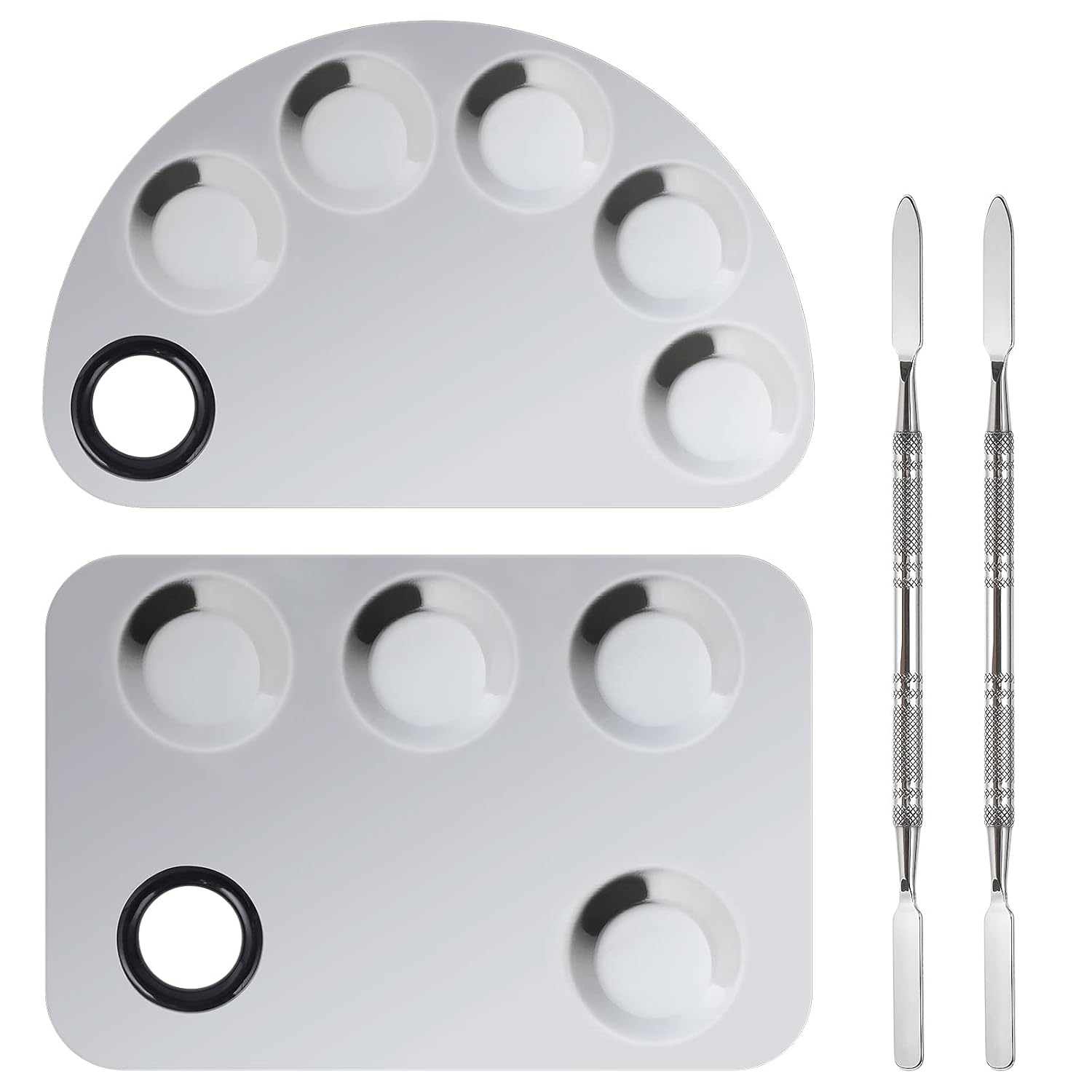 Package ContentsPackage Including 2 Pieces Makeup Palette. One Is 4-Well Rectangular(6.2 Inch*3.9 Inch) With A 6.3 Inch Double-Headed Spatula Tool. The Other One Is 5-Well Fan Shaped(6.3 Inch In Length) With A Double-Ended 6.3 Inch Spatula Tool