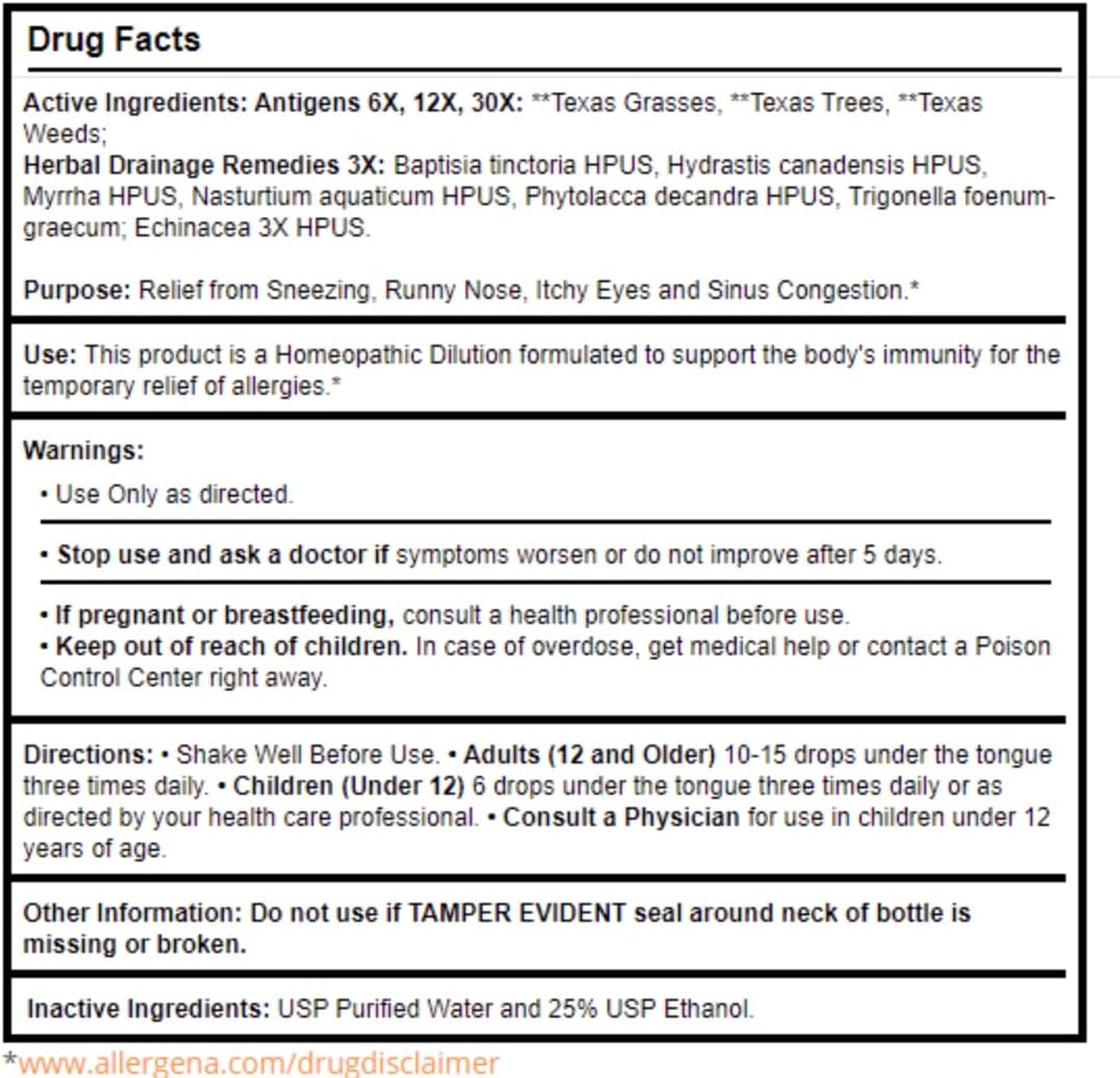 About this item SAFE & NON-DROWSY HOMEOPATHIC REMEDY: Homeopathic drops work by exposing your body to micro-doses of a myriad of trees, weeds and grasses causing your symptoms ALLERGENA Texas Trees is a Natural Allergy Relief for Kansas, Oklahoma, and Texas trees, weeds, and grasses SUB LINGUAL: Product is taken under the tongue Herbal Drainage Remedies: Baptisia tinctoria, Hydrastis canadensis, Myrrha, Nasturtium aquaticum, Phytolacca decandra, Trigonella foenum-graecum Non GMO and Gluten Free Produced in the USA in a GMP Certified Facility See more product details,SAFE & NON-DROWSY HOMEOPATHIC REMEDY: Homeopathic drops work by exposing your body to micro-doses of a myriad of trees, weeds and grasses causing your symptoms,ALLERGENA Texas Trees is a Natural Allergy Relief for Kansas, Oklahoma, and Texas trees, weeds, and grasses,SUB LINGUAL: Product is taken under the tongue,Herbal Drainage Remedies: Baptisia tinctoria, Hydrastis canadensis, Myrrha, Nasturtium aquaticum, Phytolacca decandra, Trigonella foenum-graecum,Non GMO and Gluten Free,Produced in the USA in a GMP Certified Facility
