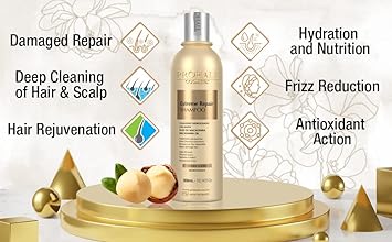 ABOUT THE PRODUCT: 1 > Shampoo Extreme Repair Macadamia ensures complete cleaning of the capillary perimeter and helps repair damaged hair. Enriched with highly nutritious properties, the product smoothes the signs of dryness and recovers the strands against damage caused by free radicals, giving a healthy appearance to the hair 2 > Shampoo Extreme Repair is a daily use product that can be used both in home care and in preparation for chemical procedures. Its technology helps in the treatment of damaged strands and guarantees much more shine, softness and vitality to the strands. The product is especially recommended for chemically treated hair and is indicated for all types of hair, including those undergoing hair transition 3 > Hydrolyzed Collagen strengthens the capillary structure and rebalances its elasticity levels, Macadamia Oil, in turn, is responsible for assisting in hydrolipid replacement and for reversing the main signs of dryness that affect the hair such as frizz, roughness and split ends, for exampleProhall Cosmetic Extreme Repair Shampoo for Dry Damaged Hair repair-Hair treatment shampoo for chemically treated hair-Shampoo for color treated hair -Shampoo for frizzy hair (10.1 fl.oz)