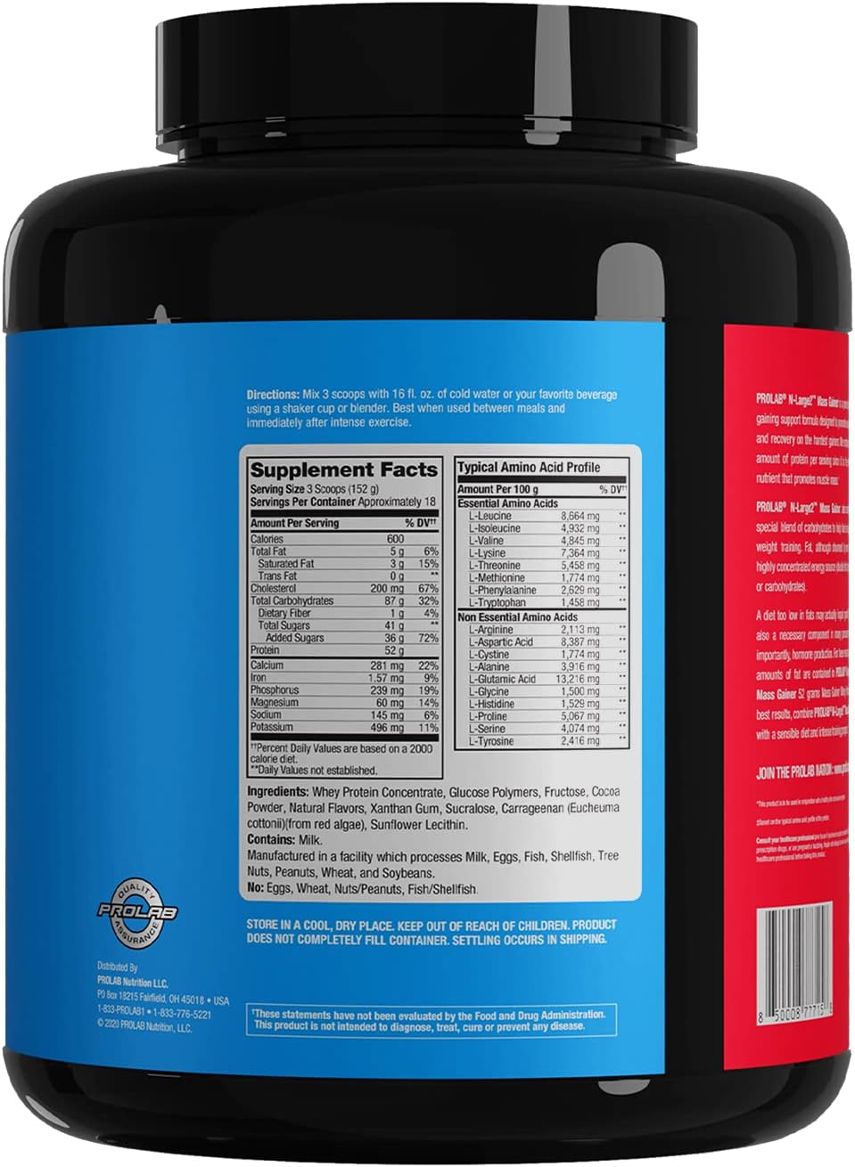 DESCRIPTION : ProLab N-Large2 Mass Gainer - Powerful Mass Gaining Support Formula - Promotes Muscle Size, Growth, and Recovery - New (Chocolate Fudge Brownie, 6 LB)