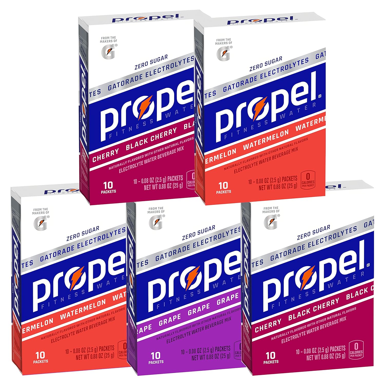 Includes 50 Propel Powder Packets: (20) Watermelon, (20) Black Cherry, And (10) Grape