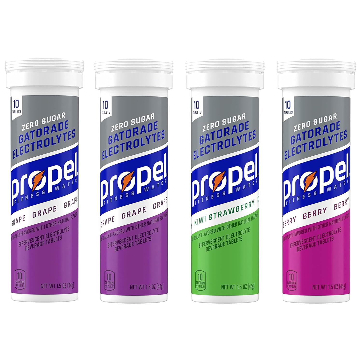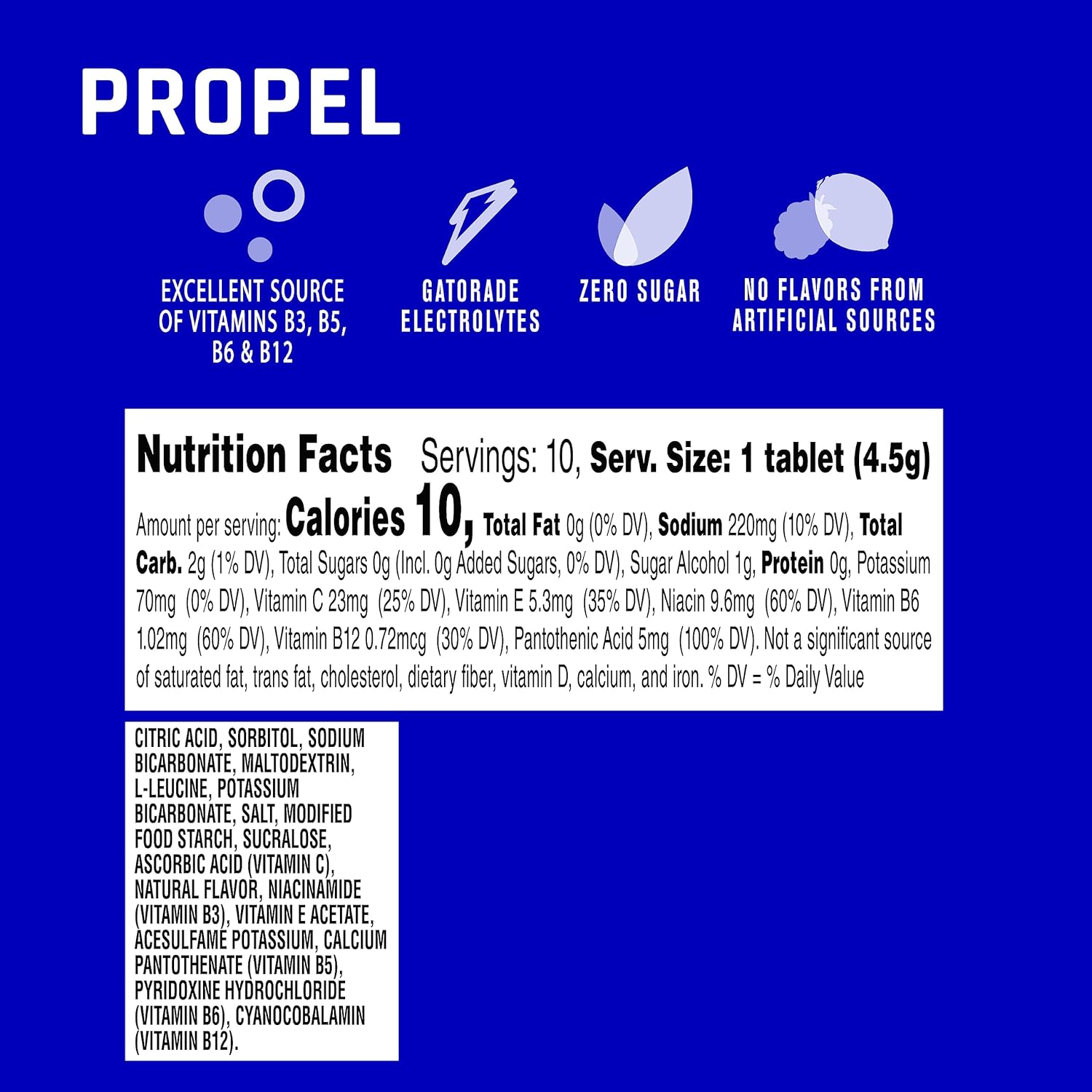 Includes 4 (1.5 Oz) Tubes Of Propel Fitness Water Tablets, 10 Tablets Per Tube. Propel Is A Low Calorie, Zero Sugar, Fitness Water Made To Replenish And Rehydrate Active Lifestyles. With Gatorade Electrolytes, Propel Fitness Water Helps To Replace What You Lose In Sweat. Made With Zero Sugar, Propel Electrolyte Tablets Help You Get The Most Out Of Your Workout And Provide An Excellent Source Of Vitamins B3, B5, B6, B12 & E As Well As A Good Source Of Antioxidant Vitamin C