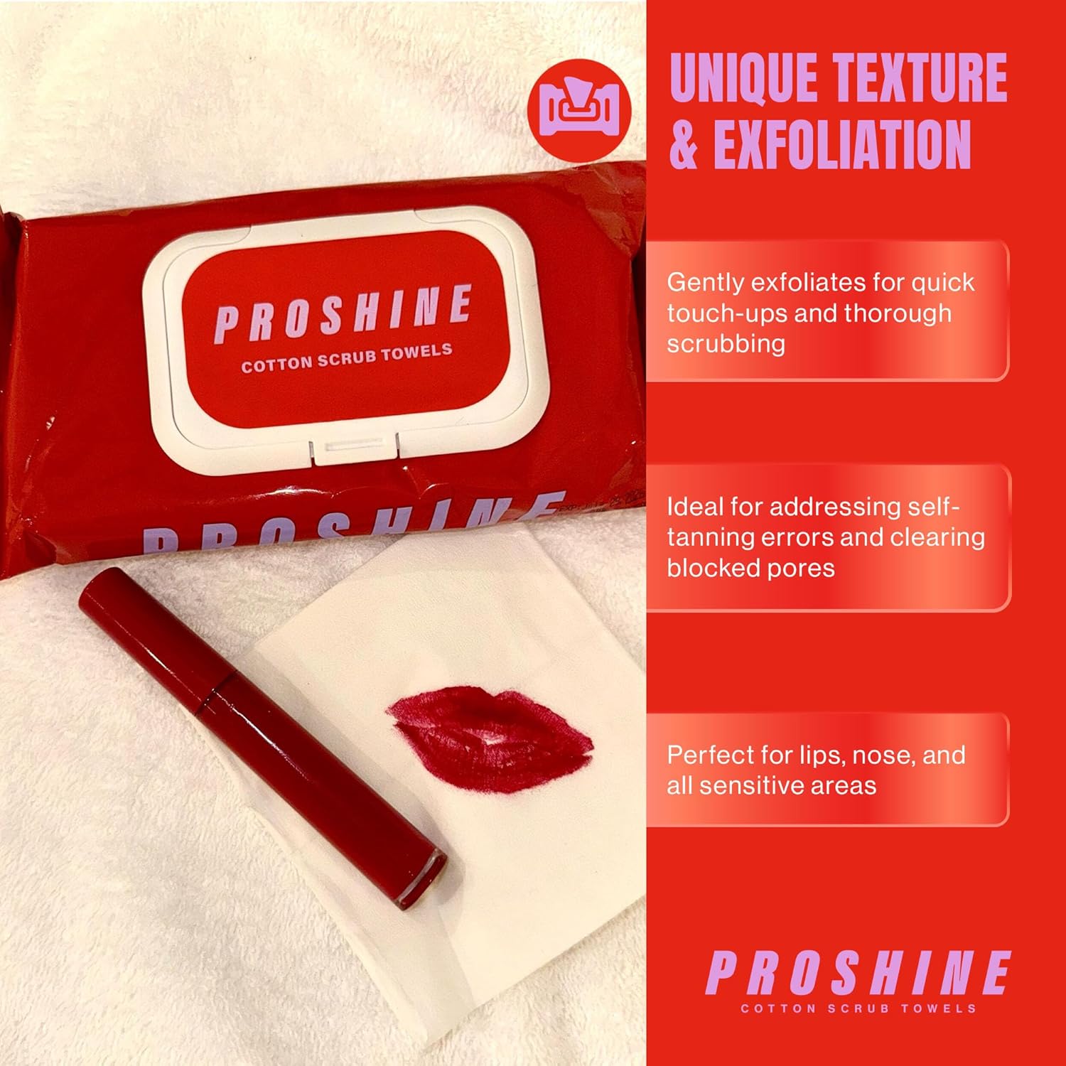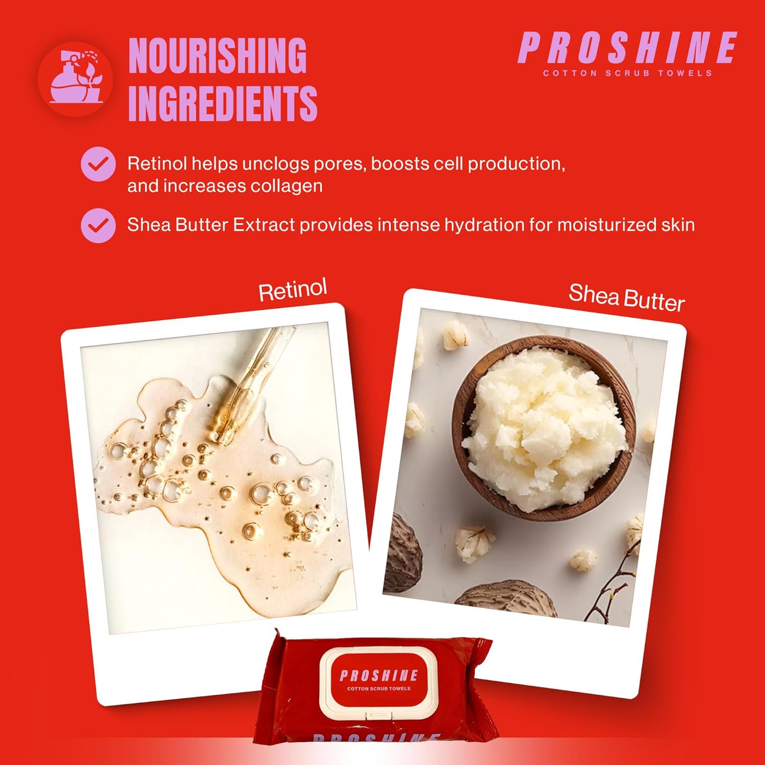 Proshine Cotton Scrub Towels For Makeup Removal - 30 Exfoliating Cleaning Wipes With Retinol And Shea Butter - Biodegradable Eye Makeup Remover And Makeup Wipes For Make Up Enthusiasts