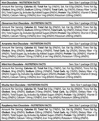 Flavor Variety Pack: This Box Includes 7 Packets, Up To 4-5 Different Flavors Of Our Protein Hot Chocolate Per Box. Each Box Can Contain A Mix Of The Following Flavors: Classic, Amaretto, Cinnamon, Mocha, Mint, Or Marshmallow! Note: You May Receive Double Of A Certain Flavor But Never More Than 2 Of The Same Flavor. You Will Receive At Least 4 Different Flavors In Each Box