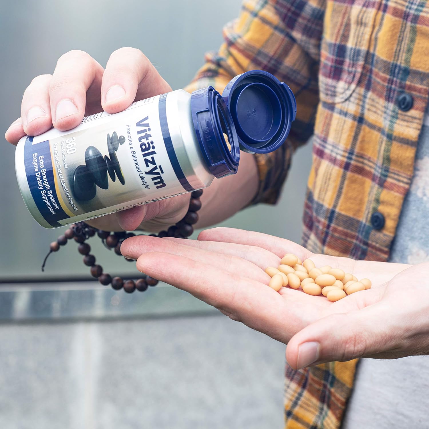 About this item ENTERIC COATED ADVANCED DELIVERY METHOD: Vitalzym high potency gel caps are unlike any tablet or powder based enzyme product available on the market today. Our formula contains no gluten, yeast or dairy and is designed to ensure maximum absorption into the bloodstream where it is then dispersed via your circulatory system throughout your body. INGREDIENTS: Vitalzym Extra Strength premium softgels are the original, all-natural, vegetarian multi enzyme complex. Vitalzym was designed using a scientific research process to identify nature’s miracle ingredients that include Serrapeptase, Bromelain, Papain, Rutin, Amylase, Protease, Lipase and Amla Extract. PROTECT YOUR HEALTH: Living well in modern times can be stressful and a source of pain at times. Vitalzym contains the most effective, purified vegan-based enzyme blend to promote healing, repair human bodily functions and leave you feeling clear and fresh. SMALL, EASY TO SWALLOW GEL CAPS: Our advanced encapsulations deliver reliable results that offer pure, potent enzymes with reliable consistency and unrivaled absorption rates. Due to the highly effective delivery rate most people need a smaller dosage, and less doses per day. MADE IN JAPAN: Created by a team of international scientists, Vitalzym works best when combined with exercise, proper fluid intake, and a healthy diet. It is important to be mindful of all aspects of your health. When used properly, Vitalzym can greatly increase your cardio, lung, blood flow, and immune response as well as provide joint, circulatory system and inflammation support and much more. See more product details,ENTERIC COATED ADVANCED DELIVERY METHOD: Vitalzym high potency gel caps are unlike any tablet or powder based enzyme product available on the market today. Our formula contains no gluten, yeast or dairy and is designed to ensure maximum absorption into the bloodstream where it is then dispersed via your circulatory system throughout your body,INGREDIENTS: Vitalzym Extra Strength premium softgels are the original, all-natural, vegetarian multi enzyme complex. Vitalzym was designed using a scientific research process to identify nature’s miracle ingredients that include Serrapeptase, Bromelain, Papain, Rutin, Amylase, Protease, Lipase and Amla Extract,PROTECT YOUR HEALTH: Living well in modern times can be stressful and a source of pain at times. Vitalzym contains the most effective, purified vegan-based enzyme blend to promote healing, repair human bodily functions and leave you feeling clear and fresh,SMALL, EASY TO SWALLOW GEL CAPS: Our advanced encapsulations deliver reliable results that offer pure, potent enzymes with reliable consistency and unrivaled absorption rates. Due to the highly effective delivery rate most people need a smaller dosage, and less doses per day,MADE IN JAPAN: Created by a team of international scientists, Vitalzym works best when combined with exercise, proper fluid intake, and a healthy diet. It is important to be mindful of all aspects of your health. When used properly, Vitalzym can greatly increase your cardio, lung, blood flow, and immune response as well as provide joint, circulatory system and inflammation support and much more