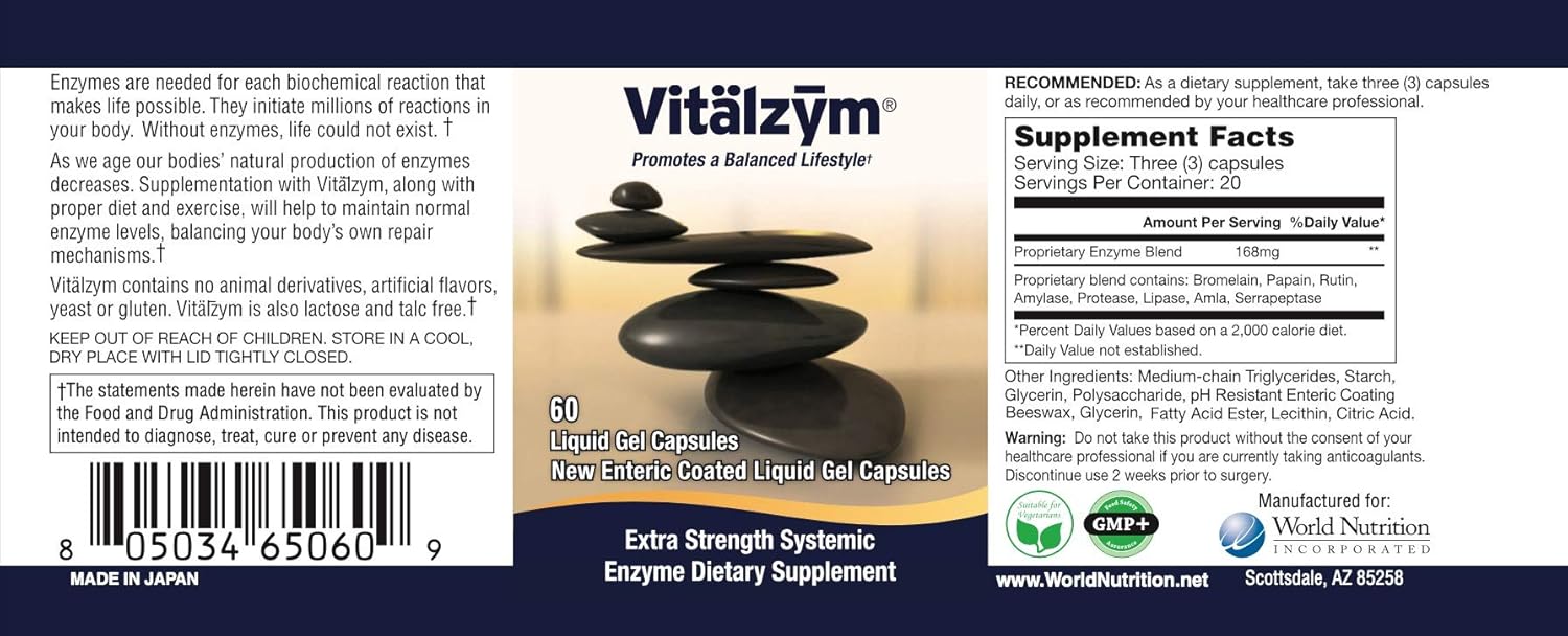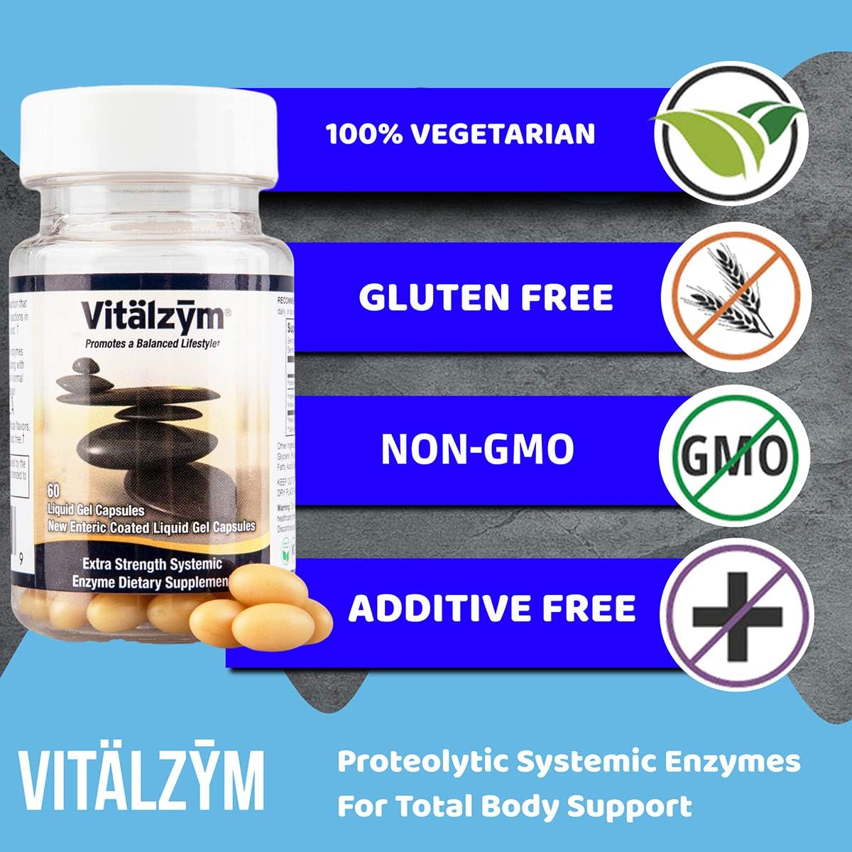 About this item Enteric Coated Advanced Delivery Method: Vitalzym high potency gel caps are unlike any tablet or powder based enzyme product available on the market today. Our formula contains no gluten, yeast or dairy and is designed to ensure maximum absorption into the bloodstream where it is then dispersed via your circulatory system throughout your body Ingredients: Vitalzym Extra Strength premium softgels are the original, all-natural, vegetarian multi enzyme complex. Vitalzym was designed using a scientific research process to identify nature’s miracle ingredients that include Serrapeptase, Bromelain, Papain, Rutin, Amylase, Protease, Lipase and Amla Extract Protect Your Health: Living well in modern times can be stressful and a source of pain at times. Vitalzym contains the most effective, purified vegan-based enzyme blend to promote healing, human bodily functions and leave you feeling clear and fresh Small, Easy To Swallow Gel Caps: Our advanced encapsulations deliver reliable results that offer pure, potent enzymes with reliable consistency and unrivaled absorption rates. Due to the highly effective delivery rate most people need a smaller dosage, and less doses per day Made In Japan: Created by a team of international scientists, Vitalzym works best when combined with exercise, proper fluid intake, and a healthy diet. It is important to be mindful of all aspects of your health. When used properly, Vitalzym can assist with cardio, lung, and immune response as well as provide joint, inflammation support and much more See more product details,Enteric Coated Advanced Delivery Method: Vitalzym high potency gel caps are unlike any tablet or powder based enzyme product available on the market today. Our formula contains no gluten, yeast or dairy and is designed to ensure maximum absorption into the bloodstream where it is then dispersed via your circulatory system throughout your body,Ingredients: Vitalzym Extra Strength premium softgels are the original, all-natural, vegetarian multi enzyme complex. Vitalzym was designed using a scientific research process to identify nature’s miracle ingredients that include Serrapeptase, Bromelain, Papain, Rutin, Amylase, Protease, Lipase and Amla Extract,Protect Your Health: Living well in modern times can be stressful and a source of pain at times. Vitalzym contains the most effective, purified vegan-based enzyme blend to promote healing, human bodily functions and leave you feeling clear and fresh,Small, Easy To Swallow Gel Caps: Our advanced encapsulations deliver reliable results that offer pure, potent enzymes with reliable consistency and unrivaled absorption rates. Due to the highly effective delivery rate most people need a smaller dosage, and less doses per day,Made In Japan: Created by a team of international scientists, Vitalzym works best when combined with exercise, proper fluid intake, and a healthy diet. It is important to be mindful of all aspects of your health. When used properly, Vitalzym can assist with cardio, lung, and immune response as well as provide joint, inflammation support and much more
