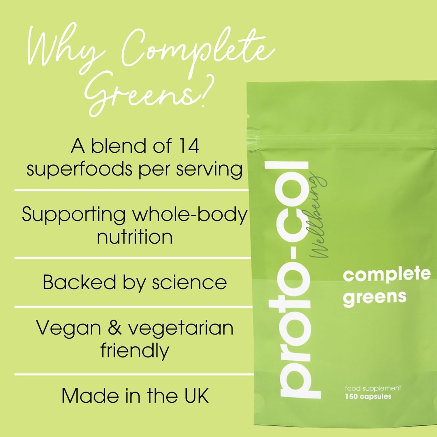 Proto-Col | Complete Greens Capsules - 15 Superfoods For Health & Vitality. Includes Ashwagandha & Spirulina | Vegan & Gluten-Free | Advanced Formula | Uk Made | 150 Capsules|