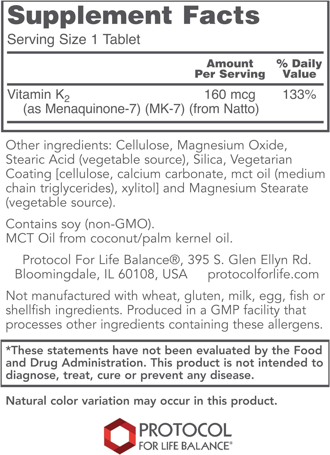 DESCRIPTION : PROTOCOL FOR LIFE BALANCE - MK-7 Vitamin K2 160 mcg - Vitamin K2 Supports Bone Health and Vascular Elasticity in Improved Nutrition Delivery System - 60 Tablets