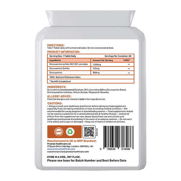 Product Information:Age, Injury, Or Ongoing Illness Can All Impair The Body’S Ability To Produce Adequate Levels Of Glucosamine. As A Result, Many People Are Turning To Glucosamine Supplements To Ensure Their Bodies Get Enough,Product Specification:Glucosamine (Crustaceans) Sulphate 2Kcl (Providing 888Mg Glucosamine Base), Microcrystalline Cellulose Silicon Dioxide, Magnesium Stearate, Hydroxpropyl Methylcellulose (Hpmc),Product Uses:Do Not Exceed The Recommended Daily Dose. Food Supplements Must Not Be Used As A Substitute For A Varied And Balanced Diet And A Healthy Lifestyle. If You Are Pregnant, Nursing Or Taking Any Medication Or Are Under Medical Supervision, Please Consult Your Doctor Or A Medical Professional Before Use. Discontinue Use And Contact A Doctor Immediately If Any Adverse Reactions Occur
