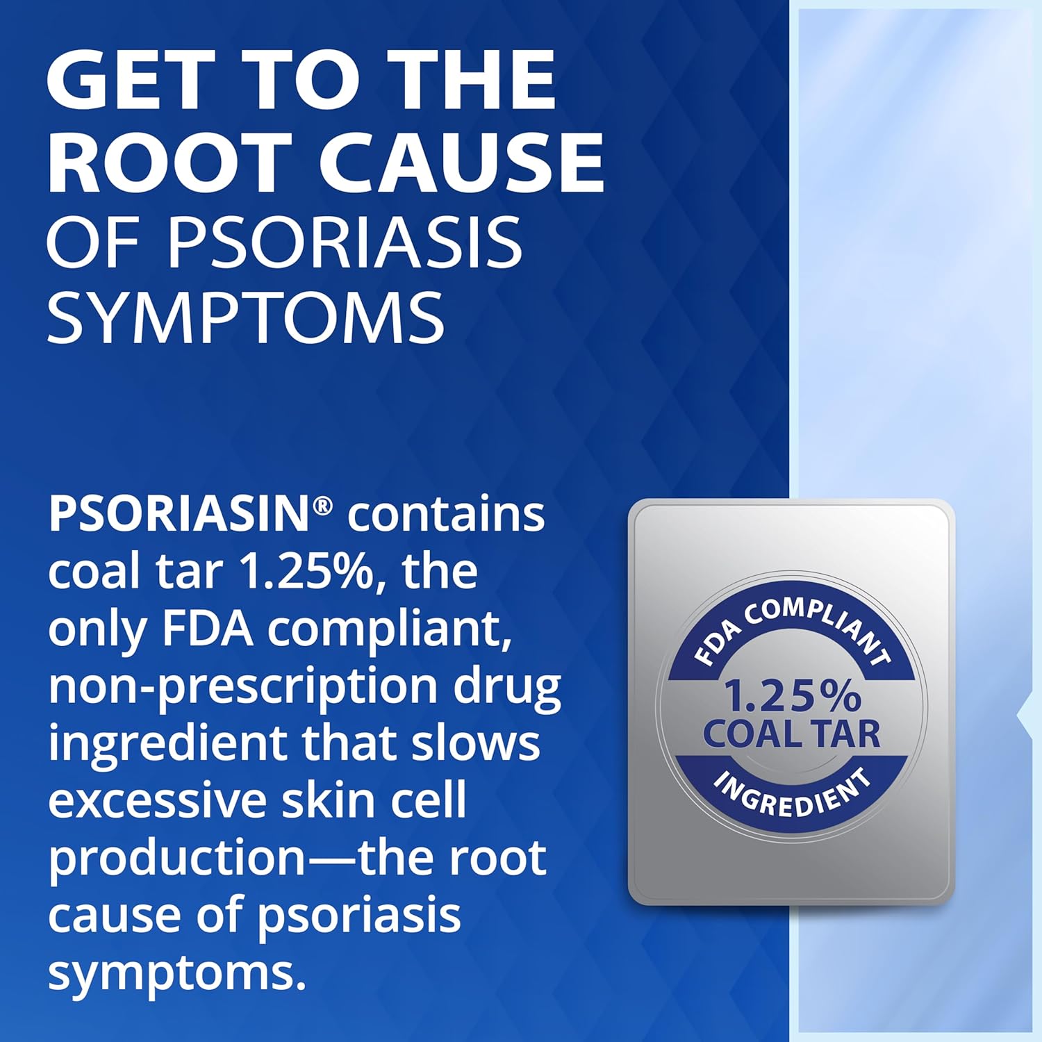 Psoriasis support: The coal tar in Psoriasin products is the only FDA compliant, non-prescription drug ingredient that slows excessive skin cell production, the root case of psoriasis symptoms