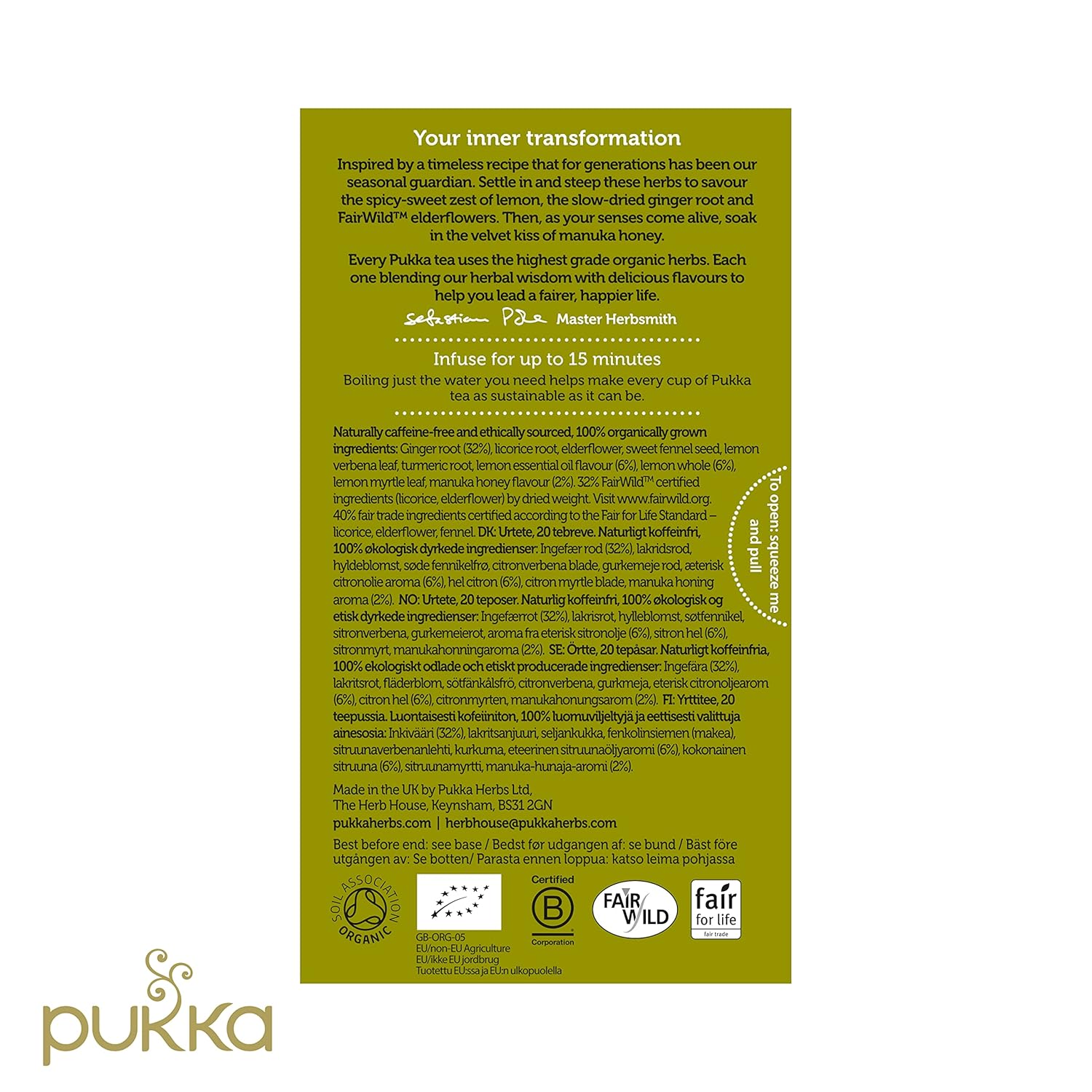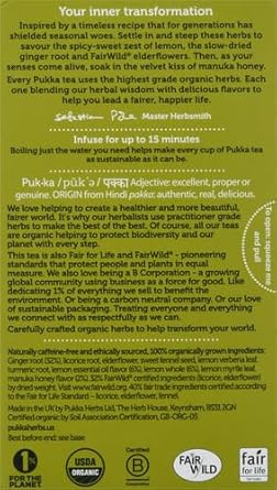 Tlc From The Heart. This Is A Moment Of Bliss – A Veritable Hug That Will Keep Your Spirits Warm. Take Your Seat And Settle In To Savour The Spicy-Sweet Zest Of Sun-Ripe Whole Sicilian Lemons To The Slow-Dried Ginger Root With Fairwild Elderflowers. Finally The Velvet Kiss Of Manuka Honey Creates A Cup Of Tea That Warms Your Heart As Well As Your Body. Isn'T This Heaven Every Pukka Plastic-Free Tea Bag Comes In Its Own Recyclable Envelope To Retain The Essential Oils In Our Organic Herbs. Each Bag Has Two Chambers, Allowing These Incredible Herbs To Flow And Release The Full Potency In Your Cup. To Help The Flavours To Fully Disperse, Pour Boiling Water Directly On The Bag. Every Herb Loves The Water, So Leave Them To Steep For The Perfect Brew. Infuse For Up To 15 Minutes. Boiling Just The Water You Need Helps Make Every Cup Of Pukka Tea As Sustainable As It Can Be
