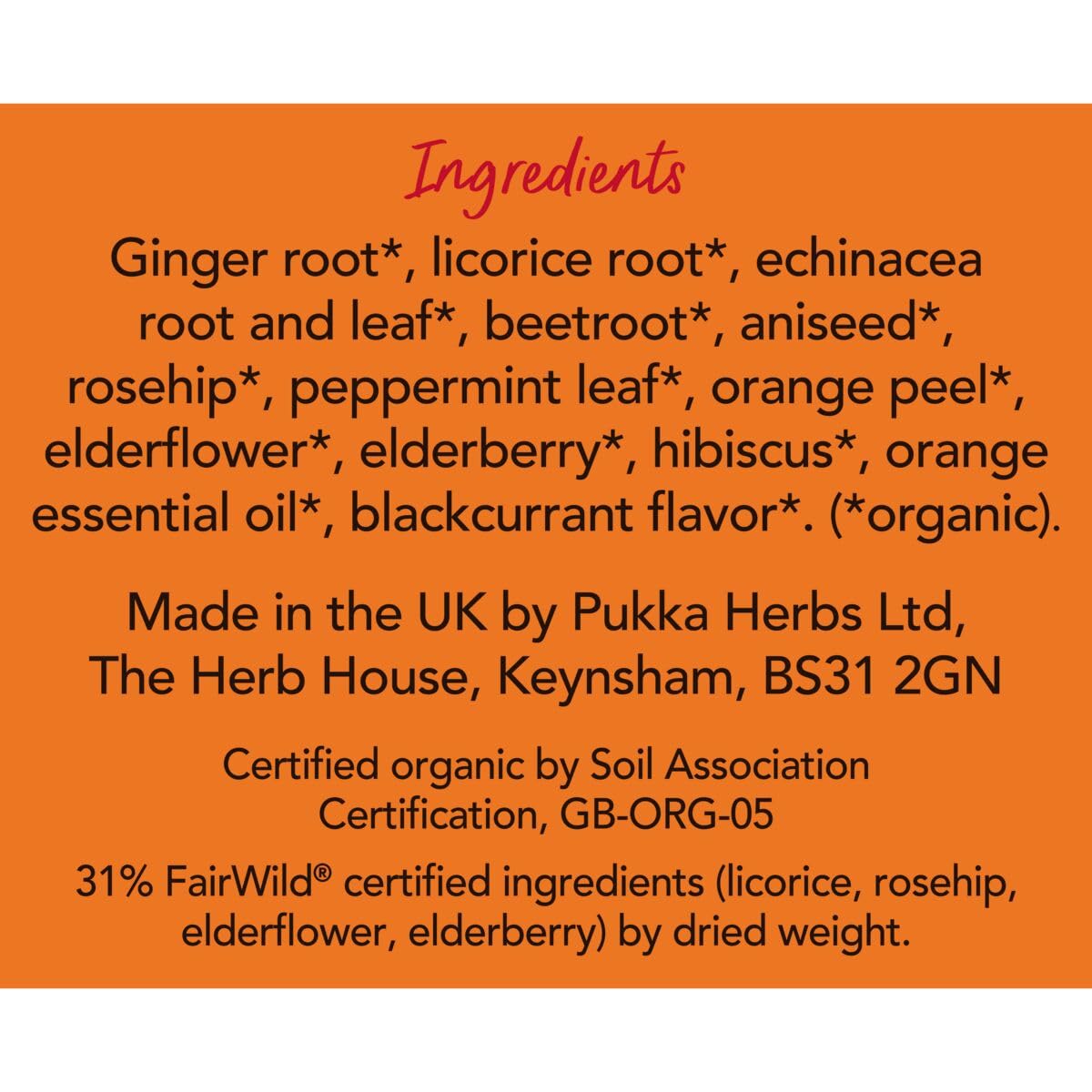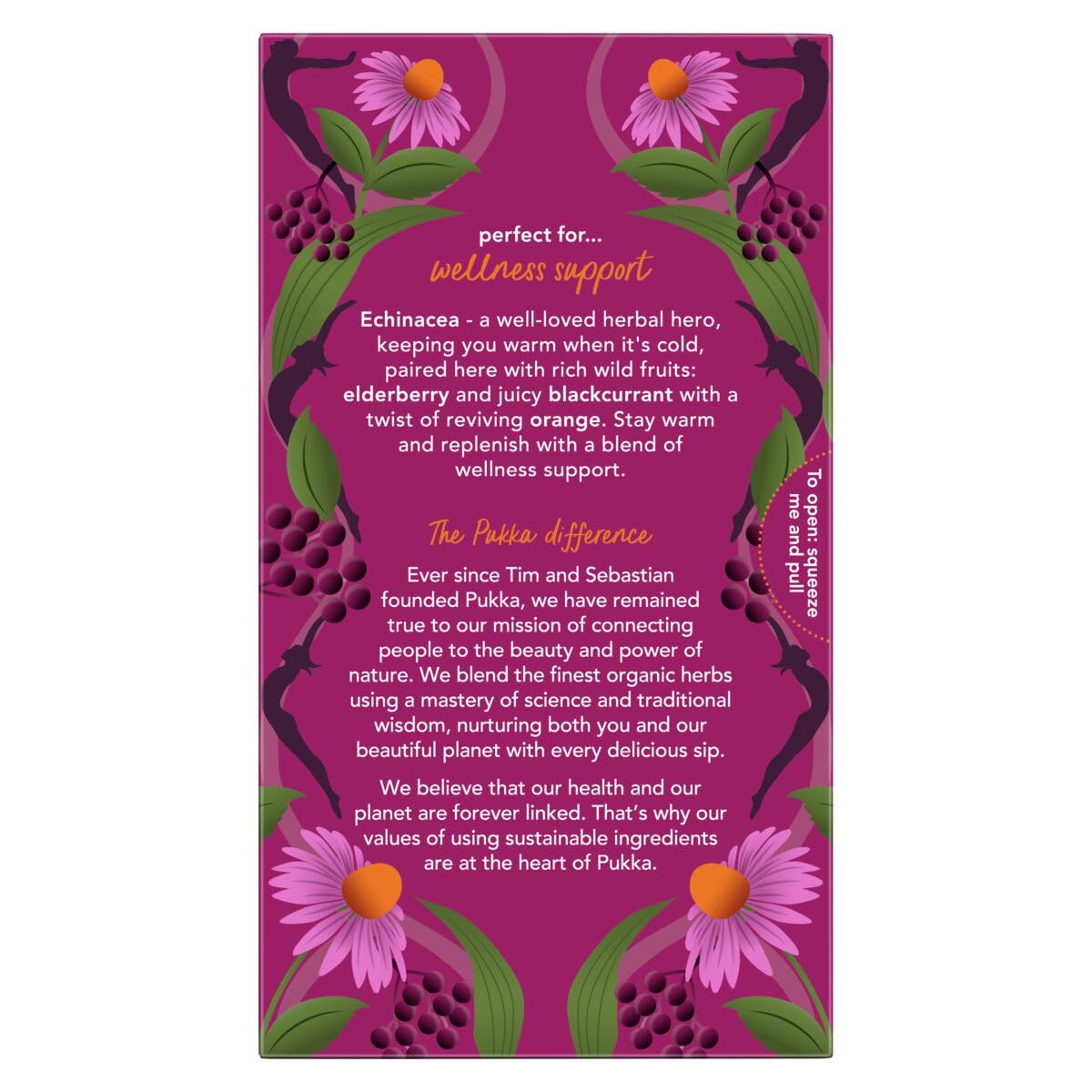 PUKKA ELDERBERRY & ECHINACEA: Indulge in a rich organic embrace tingling with fruity warmth. Pukka’s Immunity family is formulated to help both acute and longer-term immunity issues using only the finest plant-sourced organic ingredients