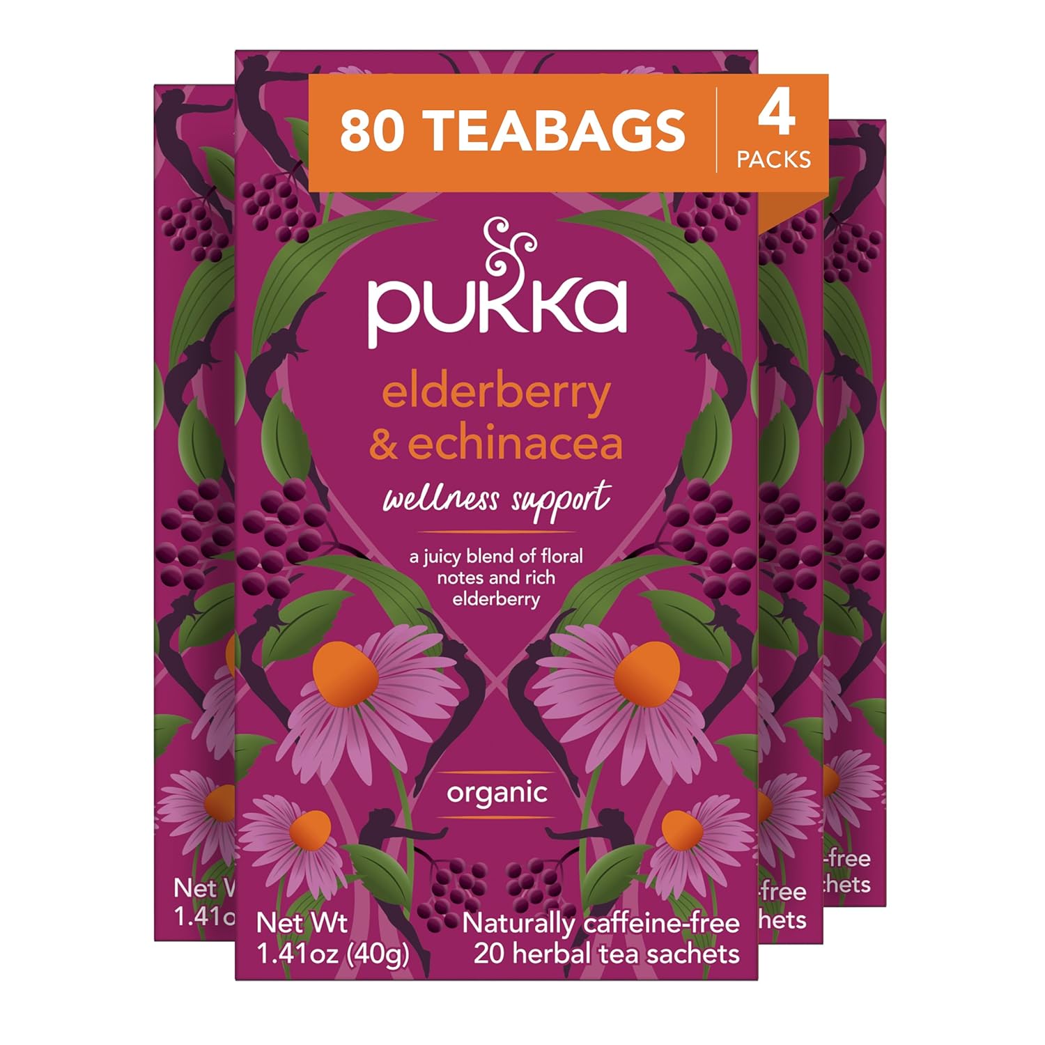 Pukka Organic Elderberry & Echinacea Herbal Tea For Wellness Support, Caffeine Free, 80 Total Tea Bags (20Ct - Pack Of 4)