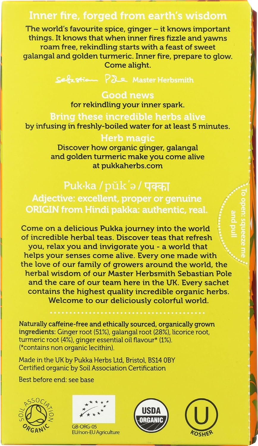Inner Fire, Forged From Earth'S Wisdom. The World'S Favourite Spice, Ginger - It Knows Important Things. It Knows That When Inner Fires Fizzle And Yawns Roam Free, Rekindling Starts With A Feast Of Sweet Galangal And Golden Turmeric. Inner Fire, Prepare To Glow. Come Alight. Every Pukka Plastic-Free Tea Bag Comes In Its Own Recyclable Envelope To Retain The Essential Oils In Our Organic Herbs. Each Bag Has Two Chambers, Allowing These Incredible Herbs To Flow And Release The Full Potency In Your Cup. To Help The Flavours To Fully Disperse, Pour Boiling Water Directly On The Bag. Every Herb Loves The Water, So Leave Them To Steep For The Perfect Brew. Infuse For Up To 15 Minutes. Boiling Just The Water You Need Helps Make Every Cup Of Pukka Tea As Sustainable As It Can Be. Good News For Rekindling Your Inner Spark. At Pukka, Our Heartfelt Desire Is To Create A Healthier, Happier World Through The Incredible Power Of Organic Herbs. We Hope You Feel Inspired To Discover More About Yourself And The Beautiful Planet On Which We All Live. Doing Good Things Helps Make Good Things Happen. We Create Things That Help You, Help Nature And Everything In-Between. It’S Called Conservation Through Commerce – Striving To Positively Change The World For You, Business And The Planet. We Are A B Corp Organisation, Giving Back 1% For The Planet, Fair For Life And Fairwild Certified. If You Enjoy Three Ginger, Why Not Discover, Elderberry And Echinacea, Lemon, Ginger And Manuka Honey, Wonderberry Green, Blackcurrant Beauty