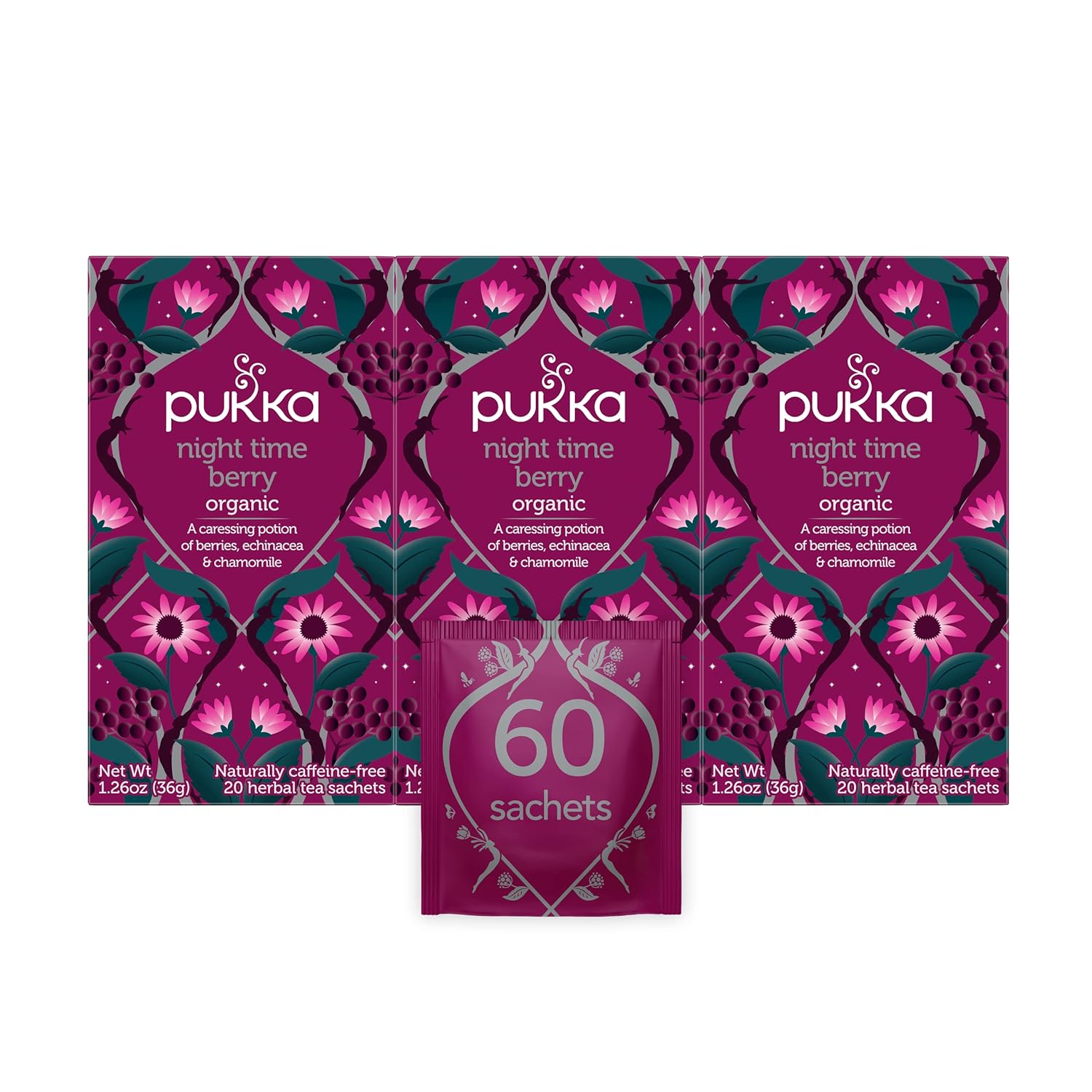 Pukka Organic Tea Bags, Night Time Berry Herbal Tea With Chamomile, Echinacea, And Elderberry, Perfect For Overnight Wellness, 20 Count (Pack Of 3), 60 Tea Bags