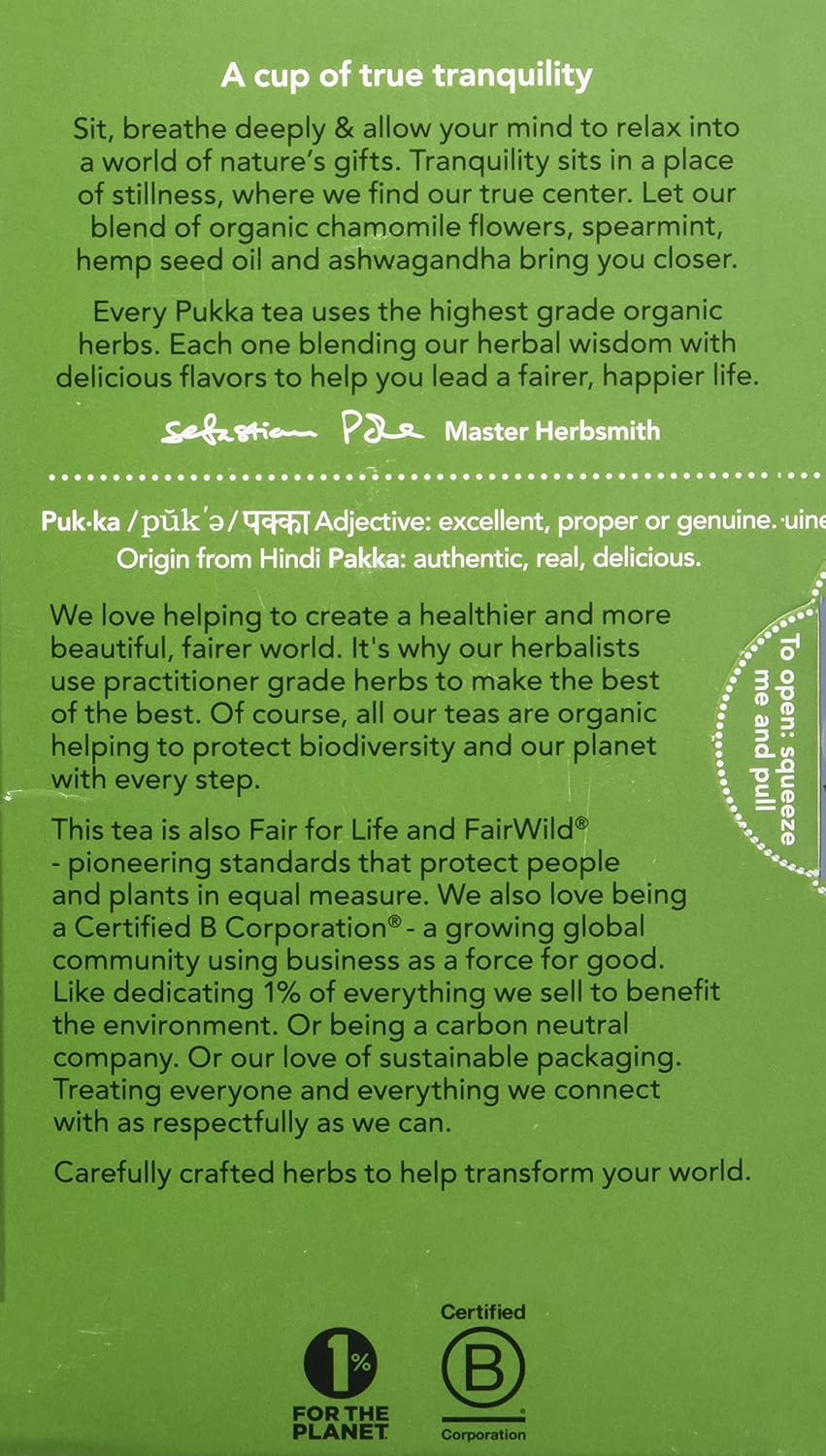 Sit Comfortably, Take A Deep Breath, And Allow Your Mind To Relax Into A World Of NatureāS Gifts. Tranquility Sits In A Place Of Stillness, Where We Find Our True Center. Let Sipping Our Organic Blend Of Chamomile Flowers, Spearmint, Hemp Seed Oil, And Ashwagandha Bring You Closer. Lovingly Crafted By Leading Herbal Experts And Nutritionists, Pukka Peace Organic Herbal Tea Finds Its True Center Between Traditional Herbal Wisdom And Scientific Research To Provide You With A Moment Of Peace. Each Compostable Tea Bag Contains Only High-Quality, Organic, Non-Gmo Herbs And Essential Oils, Sourced Precisely For Their Soothing And Adaptogenic Properties. Feel The Strain Release As You Enjoy The Serene Sensation, Finding Peace With A Perfect Cup Of Tea To Calm The Mind. Part Of Our Calm Family, This Magnificent Combination Of Herbs Is Naturally Caffeine-Free And Only Contains Ethically Sourced, Organically Grown Ingredients. The Main Ingredient, Chamomile, Is Sourced From Egypt, Hungary, And Croatia. Cultivated In Three Different Climates With Varying Weather Conditions, The Delicate Chamomile Flowers Take On Different But Equally Wonderful Flavors And Properties. Our Chamomile Is Harvested Very Early In The Morning To Ensure The Vital Essential Oils Are Not Lost, Then Are Further Preserved By Our FscĀ® Certified Recyclable Paper Sachets Until You Are Ready To Enjoy