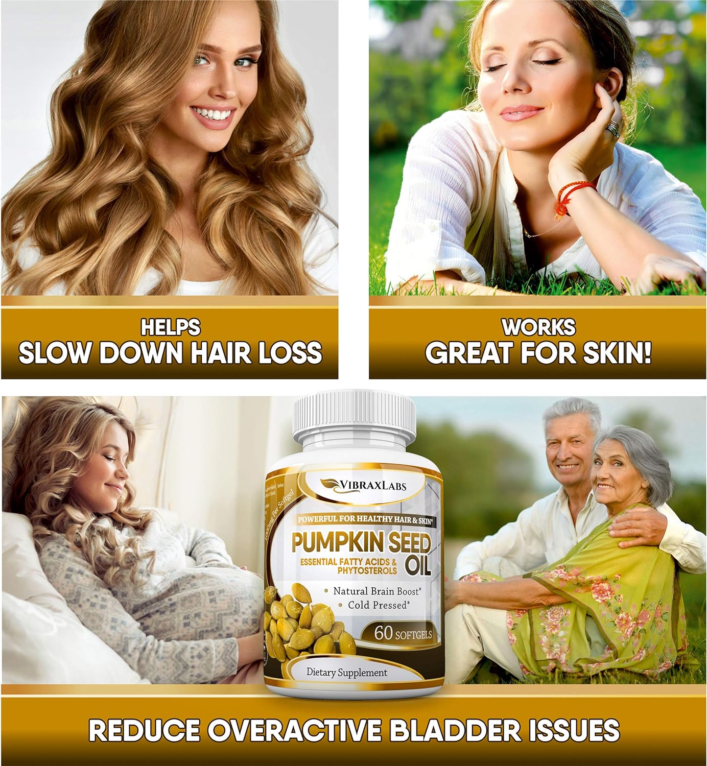 Pumpkin Seed Oil - 100% Cold Pressed Pure 1000mg Extraction - Best for Hair Growth, Younger Looking Skin & Face, Bladder Control Supplement, 60 Softgels