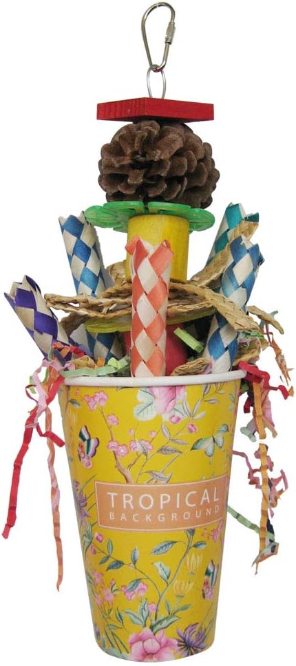 Multi-textured toy for your inquisitive Parrot to explore.Bring back some of that summer vibe with this Punch Bowl Chewable Foraging Parrot Toy. The large paper cup is filled with colourful crinkle paper, they are great fun to rip up and shred to pieces, plus they make the perfect place for hiding small treats in for your Parrot to find and enjoy. The paper cup is fastened to a metal skewer, which runs through the centre of the toy for added strength. Attached are hand-made natural straw flowers, wood shapes, plastic cogs and mahogany pod for your Parrot to chew on to maintain a healthy and trim beak. Use the metal pearlink provided to quickly and securely fasten this Punch Bowl to your birdâ€s cage or play gym stand. Please Note: Trim loose thread before handing toy over to your Parrot. Threads should be monitored and maintained daily