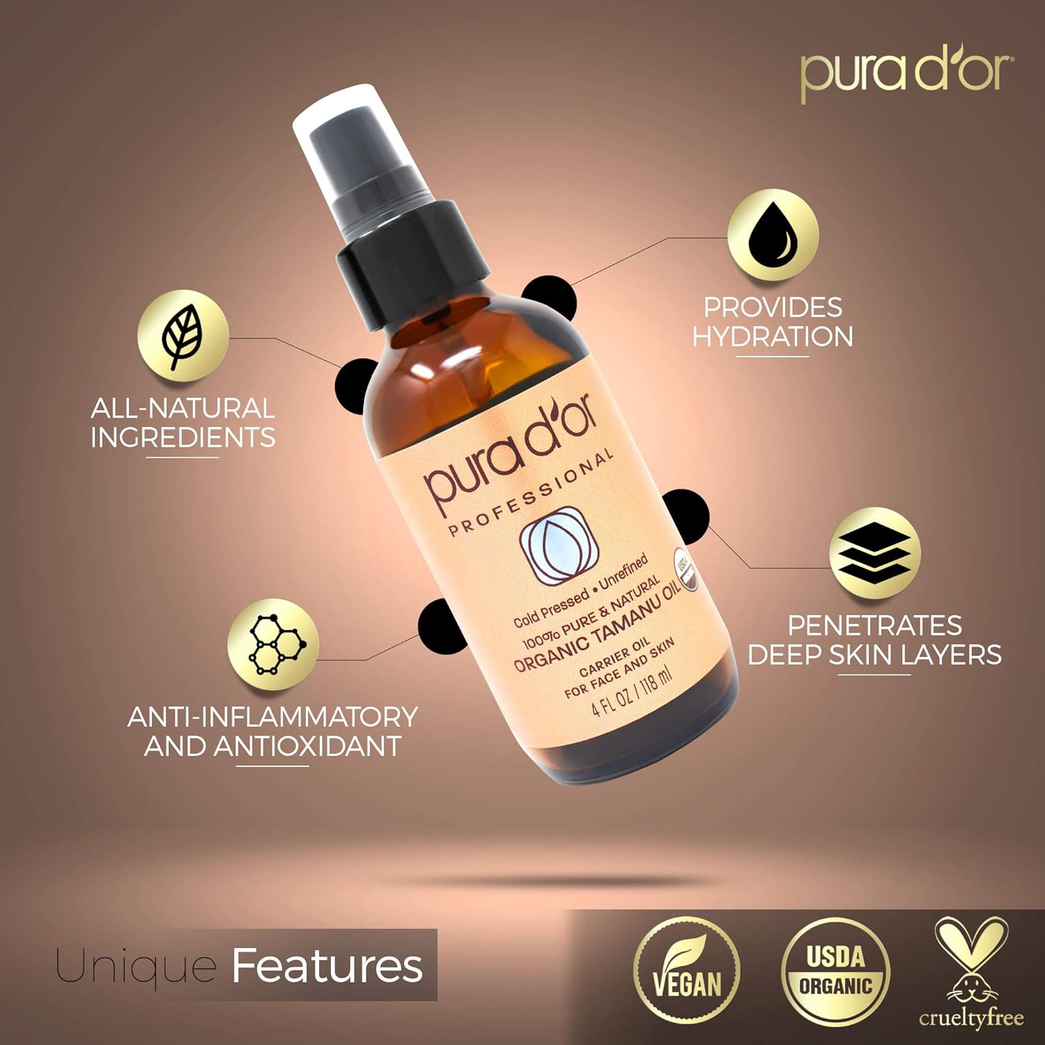 Pura D'Or 4 Oz Organic Tamanu Oil - Usda Certified 100% Pure & Natural Cold Pressed Carrier Oil, Premium Grade Moisturizer Helps Reduce Appearance Of Scars & Wrinkles - For Skin & Hair - Men & Women
