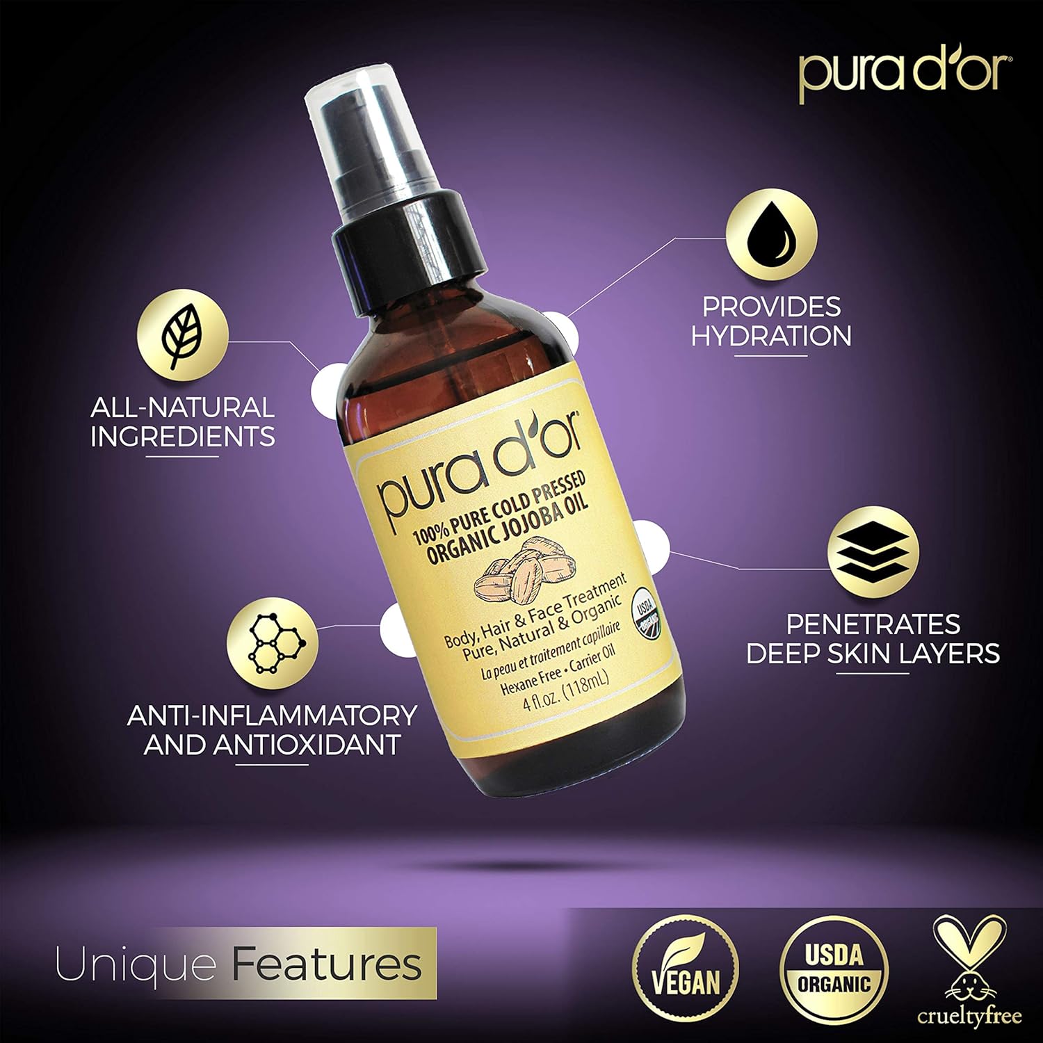 Pura D'Or Organic Jojoba Oil (4Oz / 118Ml) 100% Pure Usda Certified Premium Grade Natural Moisturizer: Cold Pressed,Unrefined,Hexane-Free Base Carrier For Diy Skin Care,Hair,Face & Nails