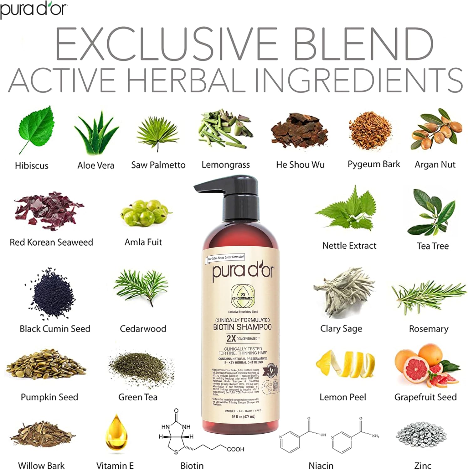 Product description PURA D'OR Maximum Strength System features 17+ key active ingredients in a premium organic aloe vera-based formula, clinically tested to combat hair loss due to breakage. *This professional system is designed with an exclusive proprietary blend to strengthen thinning hair and provide maximum moisture for stronger, healthier-looking strands with increased volume and shine. Directions Wet hair, apply shampoo, massage into scalp, rinse out, repeat if necessary,TWICE CONCENTRATED FOR BETTER RESULTS Our hair thickening shampoo is formulated with biotin and our exclusive double concentrated proprietary blend of 17 DHT blockers including nettle extract pumpkin seed & black cumin seed oil. Clinically tested & proven to reduce hair thinning promote hair strength & thickness with increased volume & reducing eakage. Individual results may vary,ORGANIC SHAMPOO INGREDIENT BASED Our biotin shampoo is made with organic argan oil vitamin e oil tea tree oil and many more premium ingredients all indicated on the labels. These essential hair vitamins help moisturize the scalp to promote thicker fuller hair in men and women. Made with no sulfates or parabens which could harm the scalp or hair growth,PROTECT & STRENGTHEN YOUR HAIR Our Professional Grade Biotin Shampoo is made with an organic aloe vera base instead of a water base for the cleanest organic cruelty free and best natural shampoo,IMPROVED HAIR APPEARANCE Our professional grade shampoo is safe to be used as a daily routine shampoo. Also works great if you need hair products for dry damaged hair and as a color treatment shampoo for women and men. This scalp treatment helps cleanse improving the overall health of your hair
