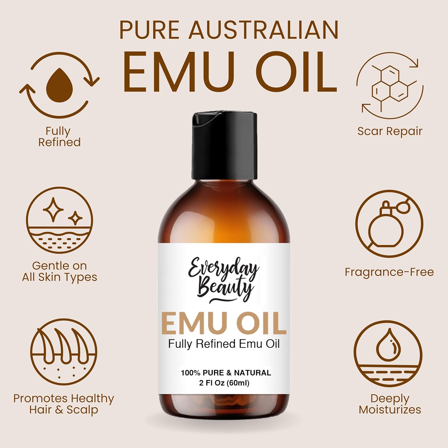 About this item Deep Moisturizing Properties - Pure Australian Emu Oil deeply penetrates the skin and scalp, providing superior hydration and preventing dryness without clogging pores, making it ideal for all skin and hair types Rich in Essential Fatty Acids - With a high content of omega-3, 6, and 9 fatty acids, emu oil nourishes and strengthens skin and hair, promoting elasticity and reducing the appearance of aging Perfect For All Skin and Hair Types - Its natural moisturizing properties help soothe dry, damaged skin as well as scalp and hair. Pure & All Natural Austrailian Emu Oil - Packed full of antioxidants and everything your skin and hair need. Our Emu Oil is 6x refined, apply it directly to your face, skin & hair or simply add to your moisturizer. Hair Conditioning and Growth - When applied to the scalp, emu oil conditions the hair and may promote hair growth in thinning areas. It helps nourish the scalp, reducing dryness and flakiness. See more product details,Deep Moisturizing Properties - Pure Australian Emu Oil deeply penetrates the skin and scalp, providing superior hydration and preventing dryness without clogging pores, making it ideal for all skin and hair types,Rich in Essential Fatty Acids - With a high content of omega-3, 6, and 9 fatty acids, emu oil nourishes and strengthens skin and hair, promoting elasticity and reducing the appearance of aging,Perfect For All Skin and Hair Types - Its natural moisturizing properties help soothe dry, damaged skin as well as scalp and hair,Pure & All Natural Austrailian Emu Oil - Packed full of antioxidants and everything your skin and hair need. Our Emu Oil is 6x refined, apply it directly to your face, skin & hair or simply add to your moisturizer,Hair Conditioning and Growth - When applied to the scalp, emu oil conditions the hair and may promote hair growth in thinning areas. It helps nourish the scalp, reducing dryness and flakiness
