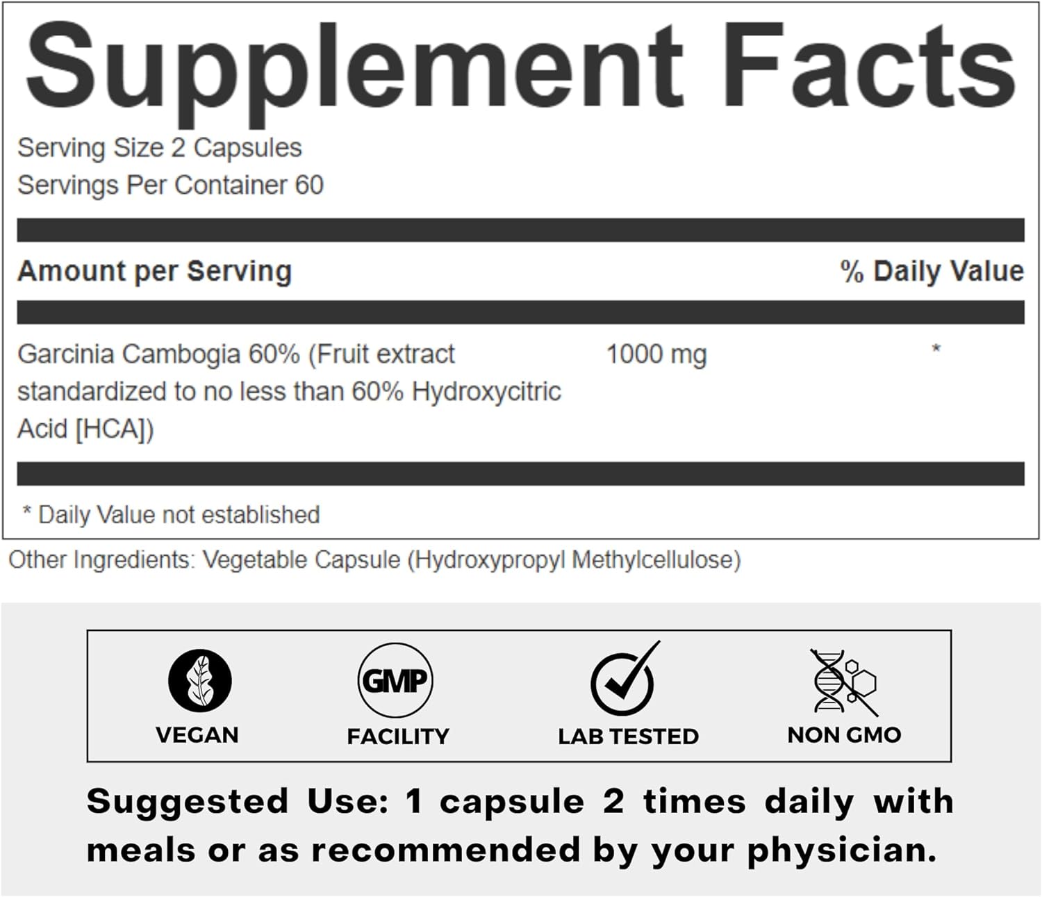 Natural Plant Extract: Garcinia Cambogia 60% extract is derived from the rind of Garcinia cambogia fruit, which is native to Southeast Asia. This extract is standardized to contain 60% hydroxycitric acid (HCA), the active compound believed to offer potential benefits10Optimized Purity and Clinically Studied – Our Garcinia supplement is delivered at optimized std. purity of 65% of HCA that is clinically researched for efficacy and toxicity at that optimized purity10Clean label - Our Garcinia supplement is 100% clean label and delivered in a pharmaceutical grade dosage with no excipients, additives, preservatives, artificial colors or flavors. It is a pure dosage of Garcinia extract in vegetable capsules10Supports Healthy Digestion & Metabolism: Garcinia cambogia extract is known to potentially support metabolic function. It is believed that the active ingredient, HCA, may help enhance metabolism and support healthy digestion10Tested & Trusted - Our Garcinica Cambogia extract supplements are manufactured in GMP-compliant and US-FDA registered facility. Our products are non- GMO, gluten-free, vegan-friendly, and tested in 3rd party labs making it suitable for individuals with dietary restrictions1010