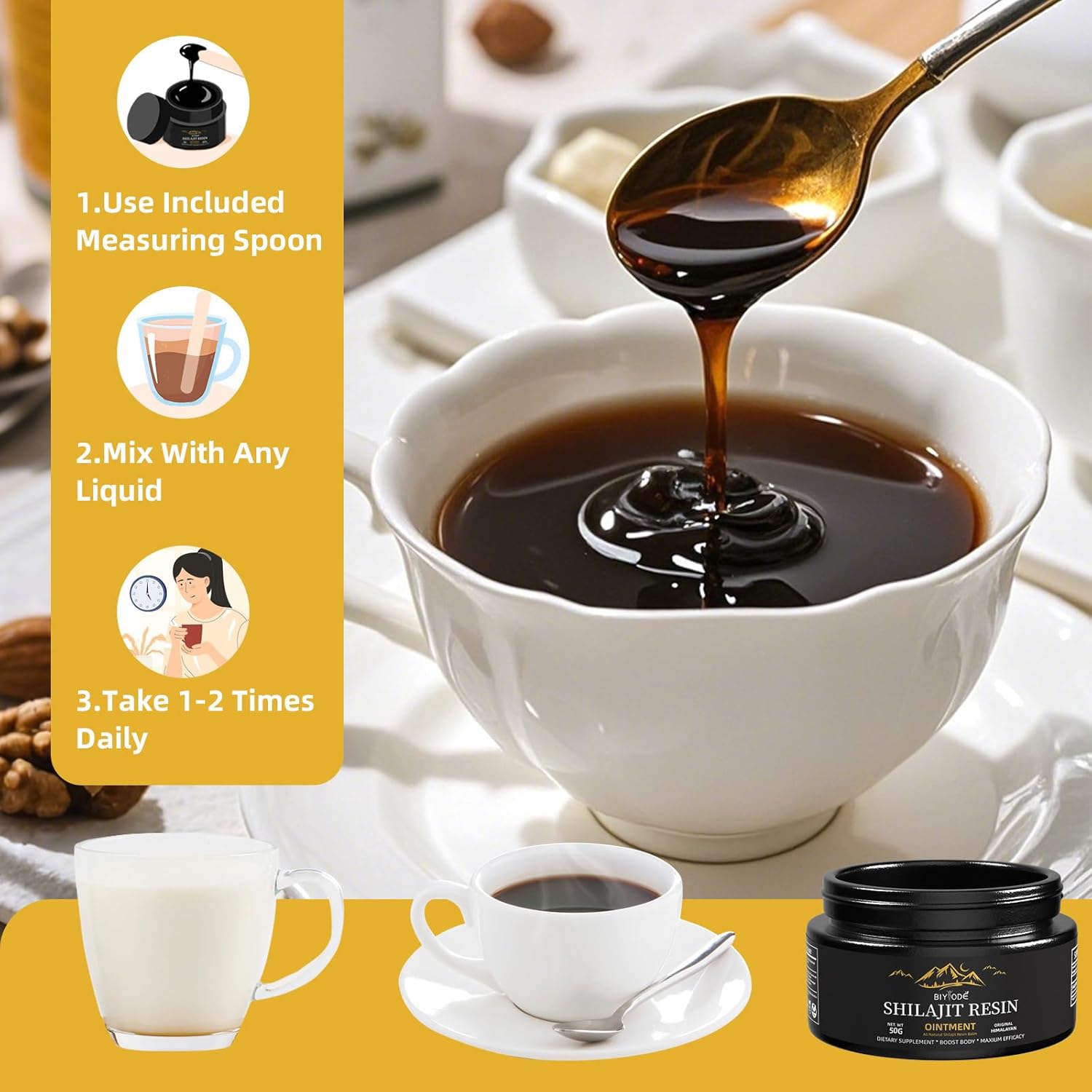 About this item Himalayan Heritage: Sourced from 18,000 ft Himalayan peaks, our resin is formed through centuries of natural mineral enrichment, capturing the essence of pristine snowmelt and nutrient-rich rocks Ancient Ayurvedic Extraction: Meticulously processed using time-honored Ayurvedic methods to preserve purity, potency, and bioactive compounds for maximum nutrient absorption 85+ Minerals & Fulvic Acid Complex: Enhances energy, immunity, and vitality by delivering essential trace minerals (iron, zinc, magnesium) paired with fulvic acid for superior bioavailability Versatile & Clean Formula: Unflavored, gluten-free, and vegan-friendly. Easily mix with water, smoothies, or food β just 1 serving daily for sustained vitality Supports Energy, Stamina, and Overall Wellness With its powerful blend of trace minerals and fulvic acid, our Shilajit Resin promotes sustained energy, endurance, and stamina throughout the day. It supports overall wellness, helping to combat fatigue, boost mental clarity, and enhance physical performance. βΊ See more product details,Himalayan Heritage: Sourced from 18,000 ft Himalayan peaks, our resin is formed through centuries of natural mineral enrichment, capturing the essence of pristine snowmelt and nutrient-rich rocks,Ancient Ayurvedic Extraction: Meticulously processed using time-honored Ayurvedic methods to preserve purity, potency, and bioactive compounds for maximum nutrient absorption,85+ Minerals & Fulvic Acid Complex: Enhances energy, immunity, and vitality by delivering essential trace minerals (iron, zinc, magnesium) paired with fulvic acid for superior bioavailability,Versatile & Clean Formula: Unflavored, gluten-free, and vegan-friendly. Easily mix with water, smoothies, or food β just 1 serving daily for sustained vitality,Supports Energy, Stamina, and Overall Wellness With its powerful blend of trace minerals and fulvic acid, our Shilajit Resin promotes sustained energy, endurance, and stamina throughout the day. It supports overall wellness, helping to combat fatigue, boost mental clarity, and enhance physical performance