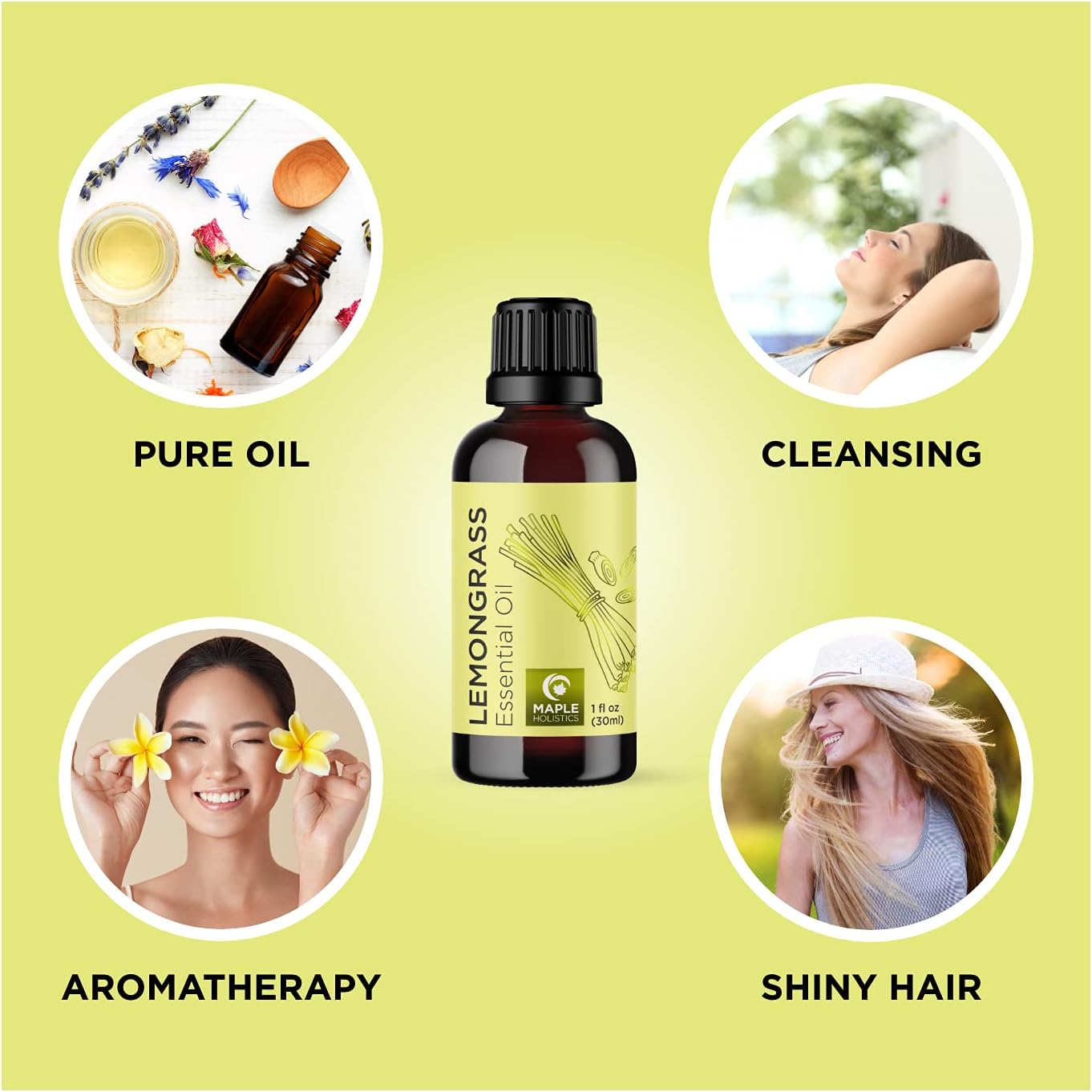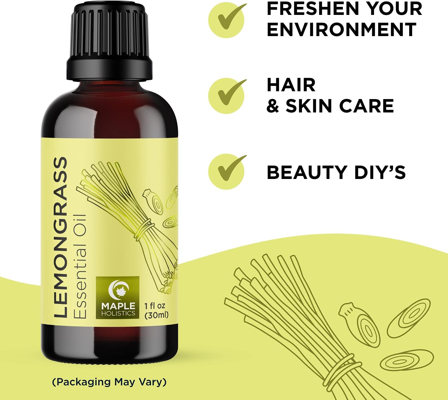 Lemongrass Essential Oil for Diffuser - Enjoy this citrus essential oil at home or on the go and reap the benefits of one of the best aromatherapy diffuser oils that pleases the body and mindEssential Oils for Hair Care - Lemongrass essential oils can also be used to nourish your hair and scalp for shower aromatherapy by adding gorgeous shine and helping with common hair concernsNatural Cleaner - Upgrade you cleaning game with one of the most popular essential oils for soap making to help clean around the home thanks to the natural cleansing properties of lemongrassAromatherapy Oils for Diffuser - relax with citrus essential oils for diffuser devices and see why so many people love our aromatic essential oils lemongrass and other essential oils for humidifiersMaple Holistics Quality - take home lemongrass oil from Maple Holistics and see why we’re the trusted name in all things essential oils aromatherapy and self care because we don’t settle for lessPure Refreshing Lemongrass Essential Oil - Aromatherapy Lemongrass Oil for Hair Nails and Skin Plus Potent Natural Aromatic Essential Oil for Diffusers for Home and Travel from Maple Holistics