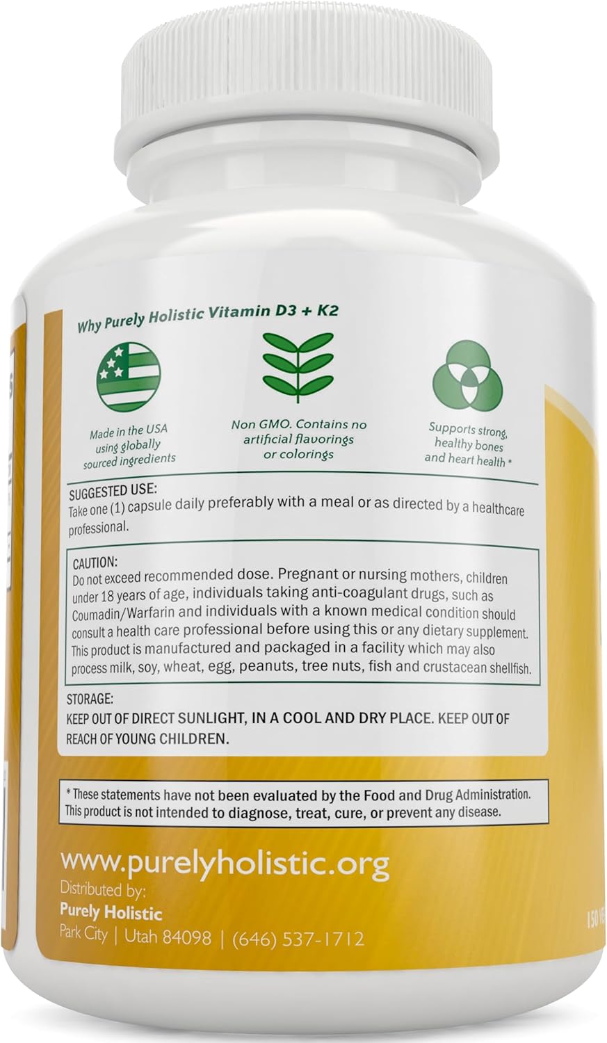Purely Holistic Vitamin D3 125Mcg And Vitamin K2 90Mcg Mk7-4 Month Supply 150 Vegetarian Capsules - Vitamin D3 & K2 Menaqunione - High Strength Cholecalciferol Made In The Usa