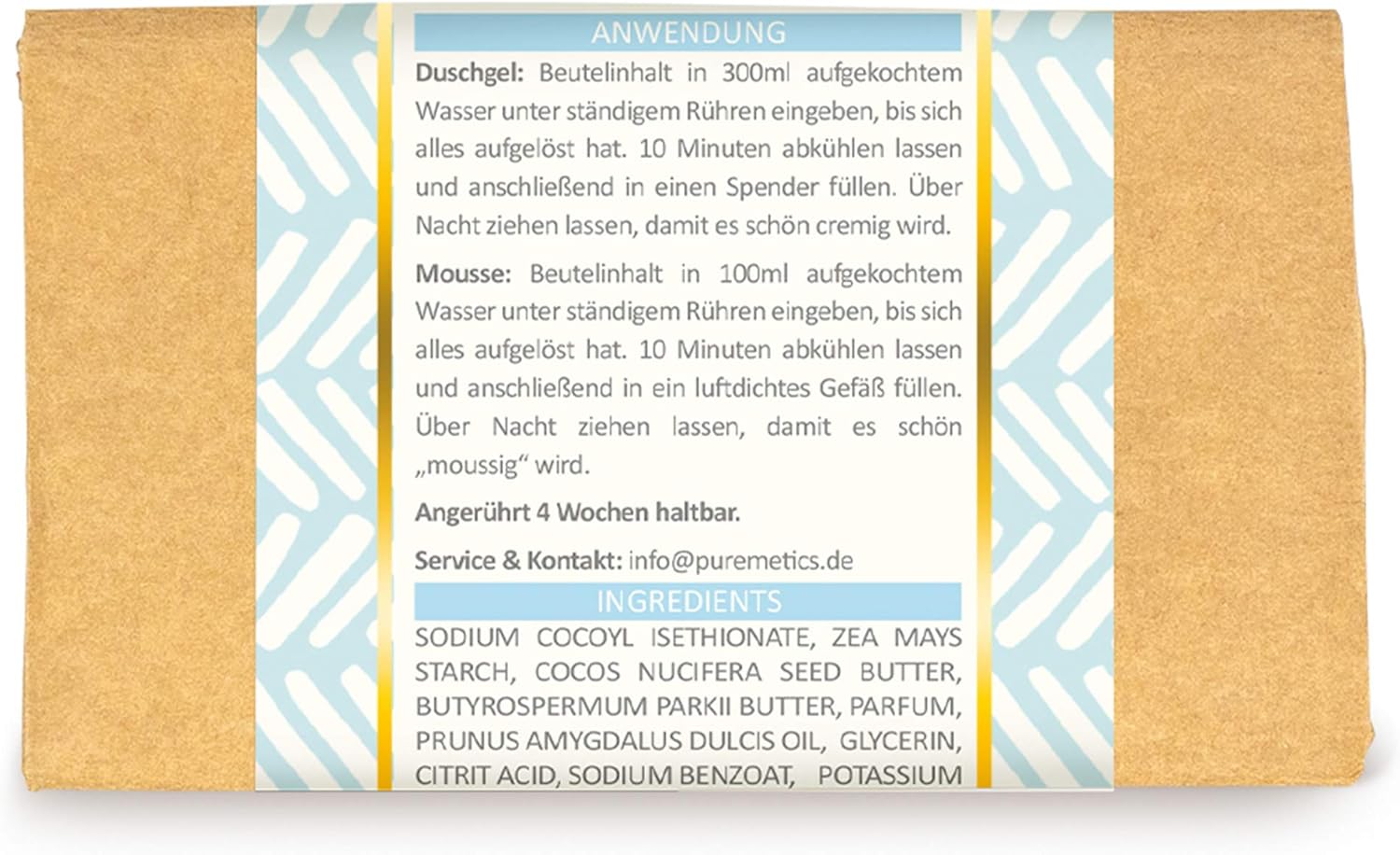Shower gel powder for mixing with water,100% free from: silicones, parabens, microplastics and palm oil,The powder is simply mixed with hot water and then results in a mousse or gel depending on the ratio,International products have separate terms, are sold from abroad and may differ from local products, including fit, age ratings, and language of product, labeling or instructions