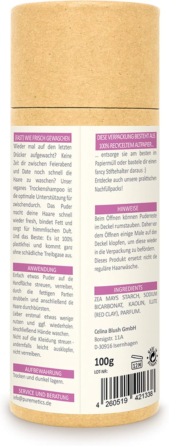 About this item (Almost) How freshly washed: woken up to the last pusher again No time to wash your hair quickly between the evening and date Our vegan dry shampoo is the optimal support for in between. The powder quickly makes your hair fresh again, binds fat and provides a heavenly fragrance. Without harmful gases: the content is made of pure active ingredient and is not stretched like its spraying species with harmful, pungent propellants. This content corresponds to approx. 15 spray cans of a conventional dry shampoo spray. This is a really cheap matter and is really good for you and the environment. Zero waste and plastic-free: the powder is packaged in a shaker made of recycled cardboard, which is produced in a climate-neutral way and is biodegradable. It is also easy to refill. The absence of unnecessary packaging waste and plastic packaging saves large amounts of waste. Sustainable and vegan: At puremetics, high-quality active ingredients and essences of nature meet a responsible interaction with the environment. No animal suffers for puremetics products - they are 100% vegan and PETA approved. Handmade in Germany: every dry shampoo is produced by hand and with great love in Germany. We also obtain everything that we can obtain regionally. For exotic ingredients, we pay attention to fair trade and good origin. Number of units: 1.0 › See more product details,(Almost) How freshly washed: woken up to the last pusher again No time to wash your hair quickly between the evening and date Our vegan dry shampoo is the optimal support for in between. The powder quickly makes your hair fresh again, binds fat and provides a heavenly fragrance,Without harmful gases: the content is made of pure active ingredient and is not stretched like its spraying species with harmful, pungent propellants. This content corresponds to approx. 15 spray cans of a conventional dry shampoo spray. This is a really cheap matter and is really good for you and the environment,Zero waste and plastic-free: the powder is packaged in a shaker made of recycled cardboard, which is produced in a climate-neutral way and is biodegradable. It is also easy to refill. The absence of unnecessary packaging waste and plastic packaging saves large amounts of waste,Sustainable and vegan: At puremetics, high-quality active ingredients and essences of nature meet a responsible interaction with the environment. No animal suffers for puremetics products - they are 100% vegan and PETA approved,Handmade in Germany: every dry shampoo is produced by hand and with great love in Germany. We also obtain everything that we can obtain regionally. For exotic ingredients, we pay attention to fair trade and good origin,Number of units: 1.0