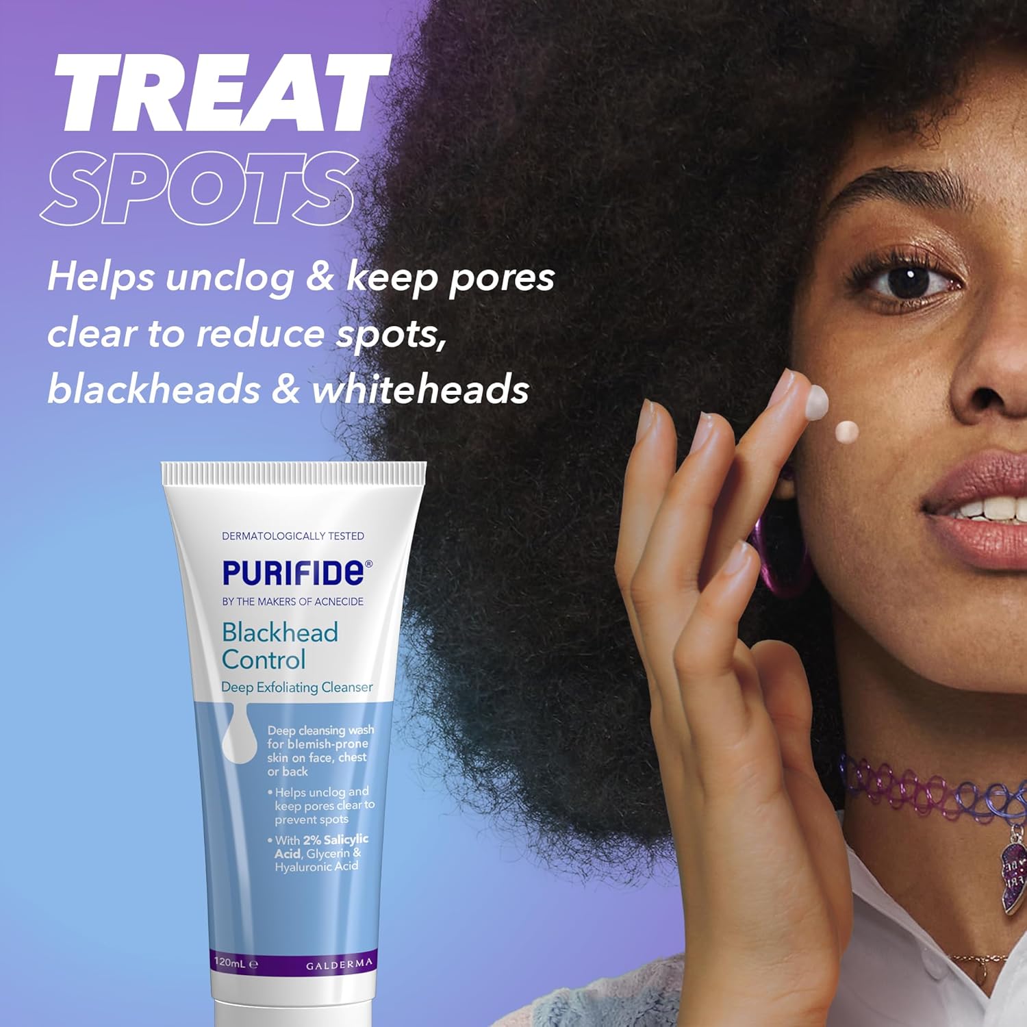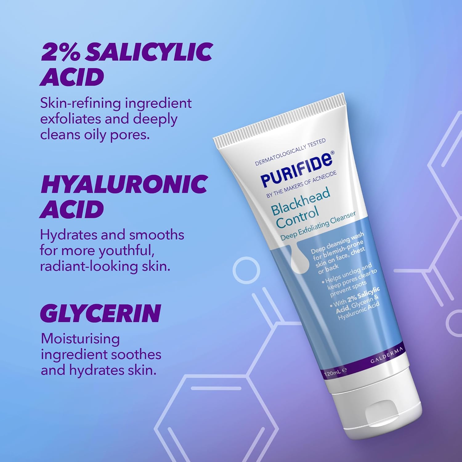 Purifide By Acnecide Blackhead Control Face Wash, Deep Exfoliating Cleanser For Acne Prone Skin 120Ml, With 2% Salicylic Acid And Hyaluronic Acid