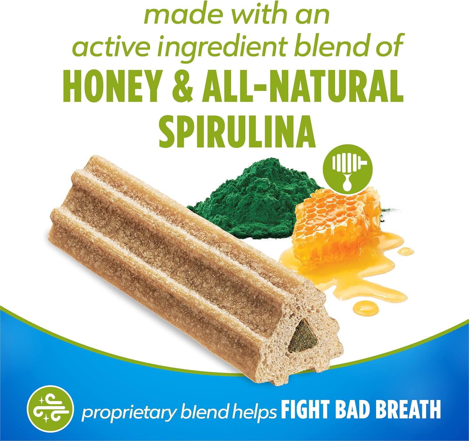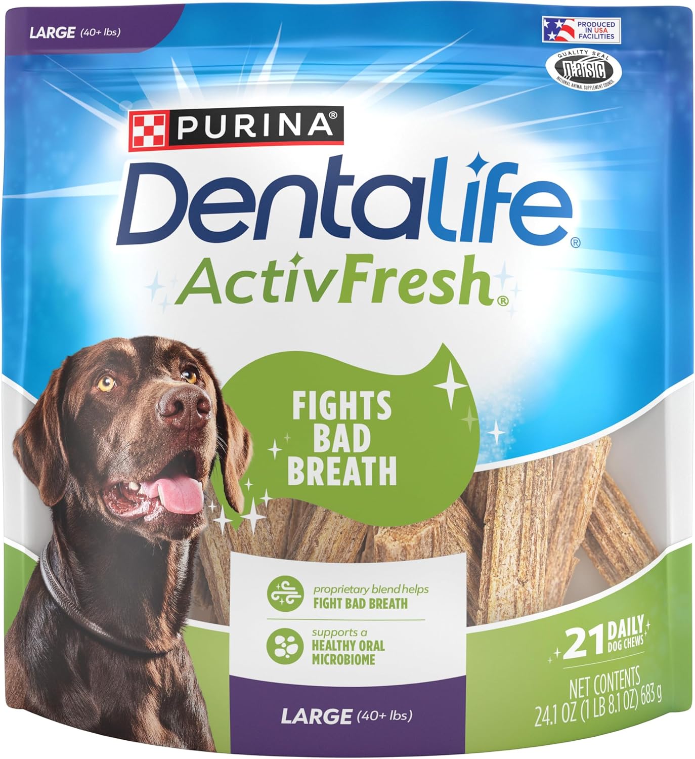 Dental Chews For Large Dogs Scientifically Tested To Attack Bad Breath At The Source With A Proprietary Active Ingredient Blend Of Honey And All-Natural Spirulina10One Of These Dog Chews A Day Supports Good Oral Health And A Healthy Oral Microbiome10Dentalife For Dogs Chicken Flavor Dog Chews Designed For Large Size (40+ Lbs.) Adult Dogs With A Unique Design That Gives Active Ingredients Time To Work10Purina Dentalife Dental Dog Chews Are Proudly Produced In Purina-Owned Usa Facilities With No Artificial Flavors, Colors Or Preservatives10These Dog Chews Are Satisfaction Guaranteed (See Packaging For Details)10Discover A Different Way To Fight Bad Breath With Purina Dentalife Activfresh Chicken Flavor Adult Large Breed Dog Chews. For Your Dog, Bad Breath Can Be One Of The Few Outward Signs Of Dental Problems Lurking Just Below The Surface. With A Proprietary Active Ingredient Blend Of Honey And All-Natural Spirulina That Fights Bad Breath At Its Source, Dentalife Activfresh Dog Chews Attack The Source Of Your Dog'S Bad Breath And Go Beyond Simply Covering It Up. Each Of These Dog Breath Chews Supports A Healthy Oral Microbiome And Has A Unique Design That Gives Active Ingredients Time To Work. When You Want To Support Your Dog'S Oral Health And Keep His Breath Smelling Clean And Fresh, Throw Him One Of These Purina Dentalife Activfresh Chicken Flavor Adult Large Breed Dog Chews, A Product Backed By PurinaāS Satisfaction Guarantee (See Packaging For Details)