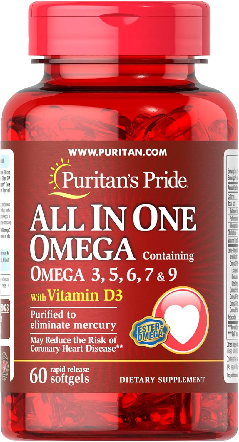 Puritan's Pride All in One Omega 3, 5, 6, 7 and 9 with Vitamin D3, 60 Count(Pack of 1)
