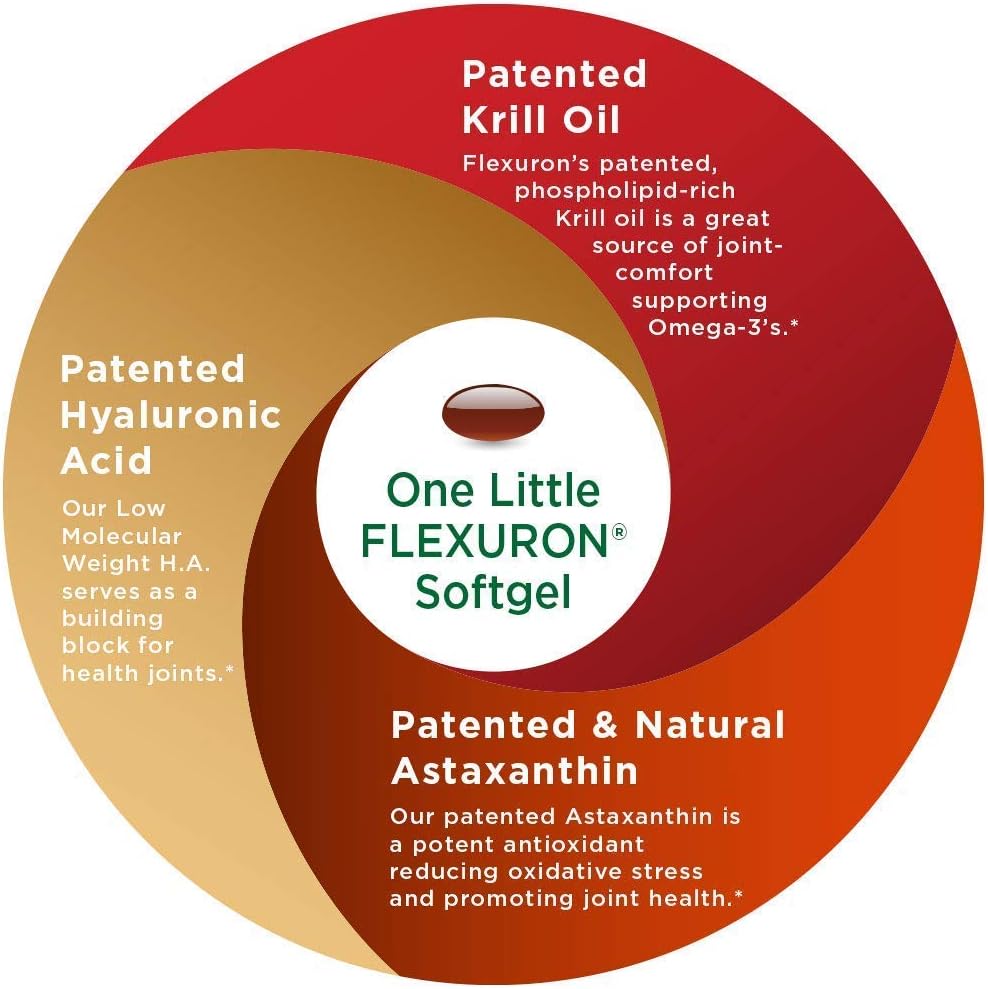 PATENTED TRIPLE ACTION FORMULA FOR YOUR JOINTS — Helps Promote Optimum, Sustained Comfort of Healthy Joints.* Plus, Flexuron raises your all-important Omega-3 Index!10WORKS FAST – IN AS LITTLE AS 7 DAYS — Clinical study participants reported Improved Joint Comfort in 7 days, with Increasing Comfort over the 56-day trial10CLINICALLY-TESTED RESULTS — A double-blind, placebo-controlled clinical study showed Flexuron to be 3X Better Than Glucosamine and Chondroitin for Supporting Joint Health10A PROPRIETARY BLEND OF 3 POWERFUL INGREDIENTS — Phospholipid Rich Omega-3 Krill Oil, Low Molecular Weight Hyaluronic Acid, and Zanthin Natural Antioxidant Astaxanthin101 EASY-TO-SWALLOW SOFTGEL — With Flexuron you take just one little pill daily instead of multiple glucosamine-chondroitin “horse pills.”10