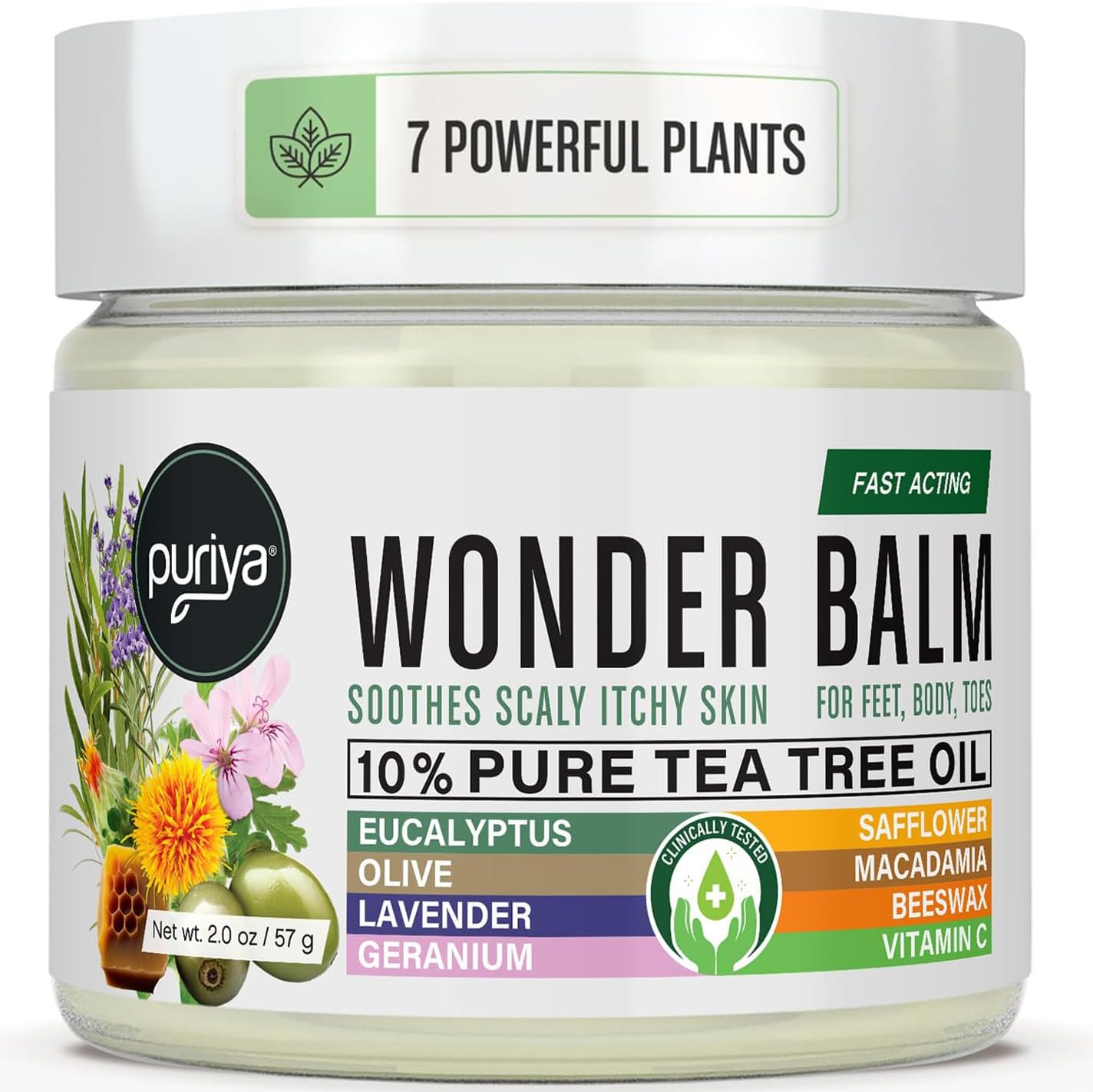About this item Extra Strength, Plant Rich Ingredients: Potent doses of tea tree essential oil and eucalyptus essential oil soothe itchy burning skin, nourishing macadamia oil relieves dryness and discomfort. Olive oil quickly penetrates and is absorbed by the skin barrier to work fast for your comfort. No preservatives, parabens, or petroleum, only safe and clean ingredients. Stay Put Formulation Safeguards Skin For Active Lifestyles: Puriya Wonder Balm is uniquely formulated with beeswax that shields skin from irritants (ones that cause itchy feet, groin discomfort, and ring shaped rashes) lurking in moist areas, such as gyms, showers, saunas, locker rooms, and swimming pools. Wonder Balm forms a barrier between surfaces and your skin no matter how active you are or how humid the environment. Tried And True Plant Rich Formula: Awarded the āFamily Tested Family Approvedā seal of approval by an independent organization that sends products to parents and families across North America to determine which products they love and use in their own homes. Try it now. You will love our cream Life Attacking Your Skin Use this cream to strengthen skinās natural barrier against irritants and natureās harsh elements, making it easier to live your life beautifully, without worrying about āthe unpredictableā roughing up your skin Sweatproof, Lightweight, Non Greasy Skin Ointment: Puriya Wonder Balm is a sweatproof formula that works around the clock to provide a natural barrier. Apply to feet, between toes, groin, and sensitive, intimate areas for continual relief that isnāt heavy and wonāt clog pores. Wonder Balm ensures your skin smells clean, use it daily to avoid embarrassing foot odor.  See more product details,Extra Strength, Plant Rich Ingredients: Potent doses of tea tree essential oil and eucalyptus essential oil soothe itchy burning skin, nourishing macadamia oil relieves dryness and discomfort. Olive oil quickly penetrates and is absorbed by the skin barrier to work fast for your comfort. No preservatives, parabens, or petroleum, only safe and clean ingredients,Stay Put Formulation Safeguards Skin For Active Lifestyles: Puriya Wonder Balm is uniquely formulated with beeswax that shields skin from irritants (ones that cause itchy feet, groin discomfort, and ring shaped rashes) lurking in moist areas, such as gyms, showers, saunas, locker rooms, and swimming pools. Wonder Balm forms a barrier between surfaces and your skin no matter how active you are or how humid the environment,Tried And True Plant Rich Formula: Awarded the āFamily Tested Family Approvedā seal of approval by an independent organization that sends products to parents and families across North America to determine which products they love and use in their own homes. Try it now. You will love our cream,Life Attacking Your Skin Use this cream to strengthen skinās natural barrier against irritants and natureās harsh elements, making it easier to live your life beautifully, without worrying about āthe unpredictableā roughing up your skin,Sweatproof, Lightweight, Non Greasy Skin Ointment: Puriya Wonder Balm is a sweatproof formula that works around the clock to provide a natural barrier. Apply to feet, between toes, groin, and sensitive, intimate areas for continual relief that isnāt heavy and wonāt clog pores. Wonder Balm ensures your skin smells clean, use it daily to avoid embarrassing foot odor