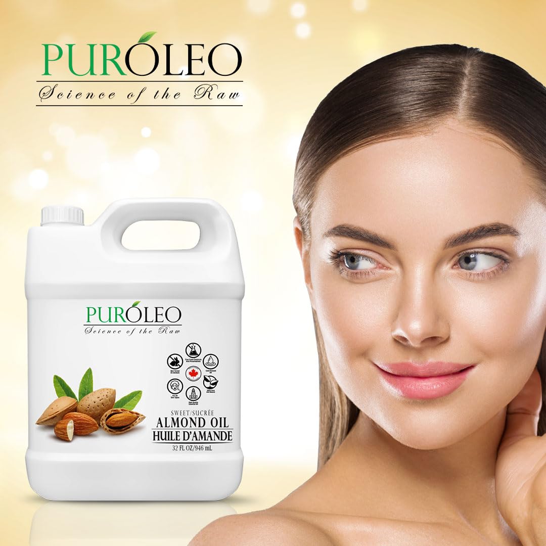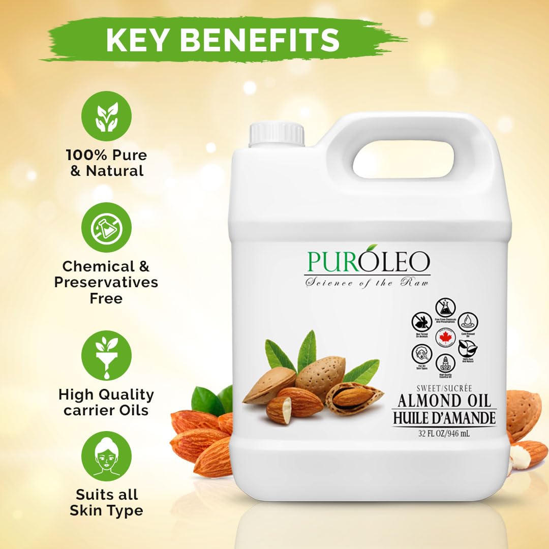 Puroleo Sweet Almond Oil 32 Fl Oz/946 Ml 100% Natural And Pure | Moisturizer & Carrier Oil | Beauty & Diy Blends, Massage Oil, Body Oil, Hair Oil And Baby Oil | Made From Almonds Raw