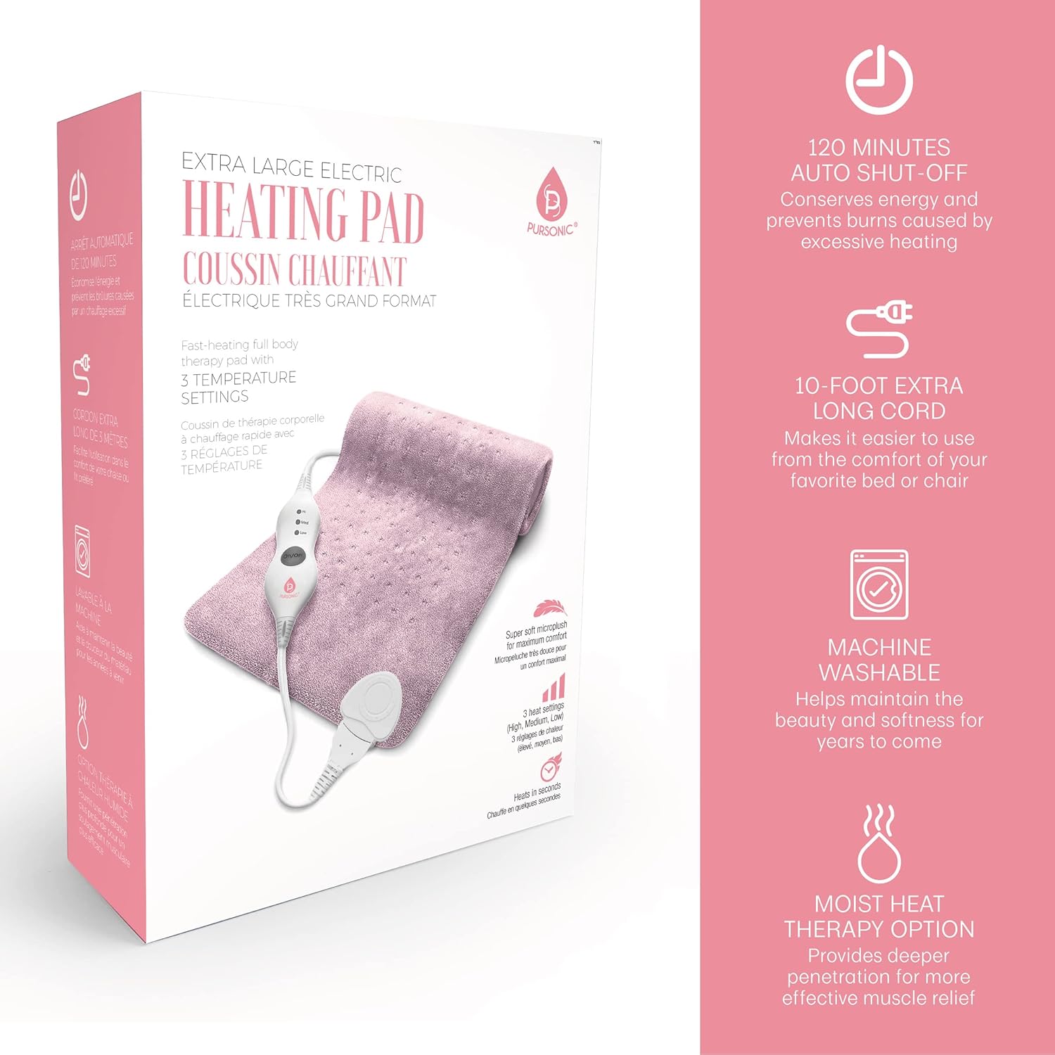 Pursonic Extra Large Electric Heating Pad For Back Pain And Cramps Relief 12X24-2 Hours Auto Shut-Off,Moist Heat Therapy Option (Grey)