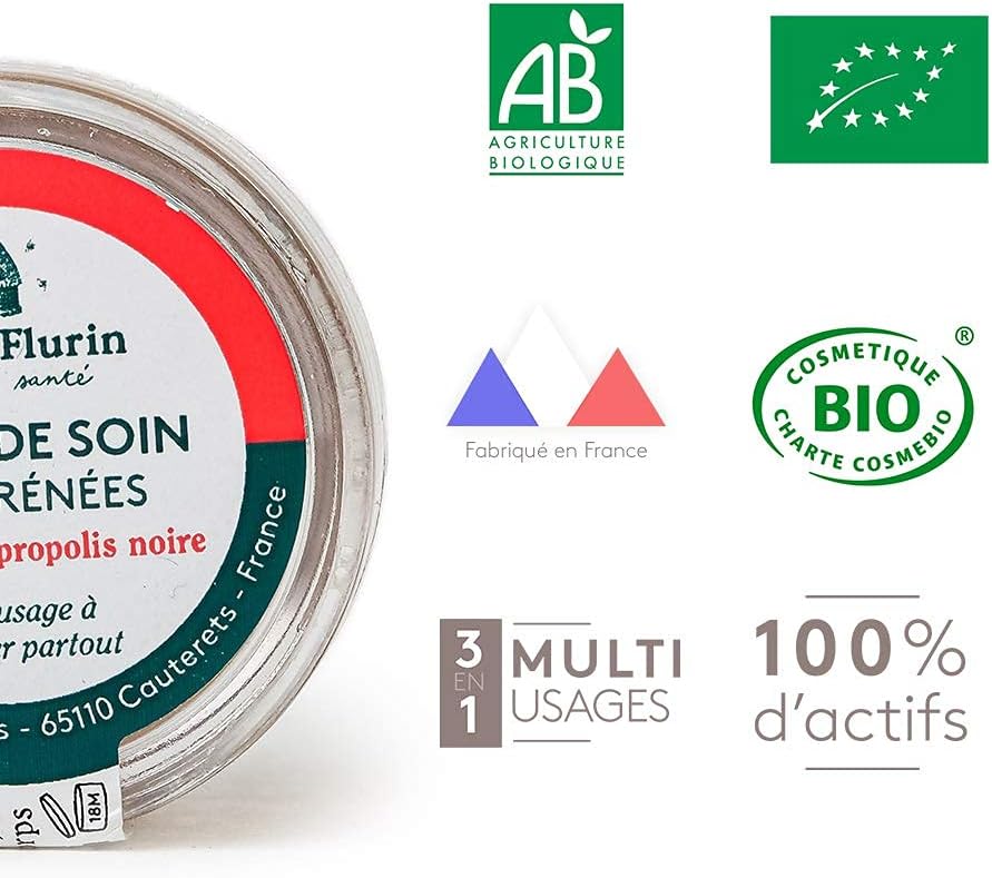 Product description nspired by an old shepherd's recipe, this multipurpose regenerating balm is a faithful friend for any occasion. This propolis balm is concentrated in organic black propolis and beeswax from our hives and rich in medicinal plants, it protects and repairs lips and skin. Suitable for all skin types, even the most sensitive, and children over the age of 7. Pleasant and natural fragrance. Ingredients Main ingredients: sesame oil *, French beeswax ultra-thin lid * (26%), Vegetable Glycerin * (5.5%), French Black propolis extract* (5%), Spain Lavender Asp essential oil* (3%), mimosa tenuiflora bark (0.55%), balsam of Peru (0.4%). INGREDIENTS (INCI) : SESAMUM INDICUM SEED OIL*, CERA ALBA*, GLYCERIN, LAVANDULA SPICA FLOWER OIL*, ALCOHOL*, PROPOLIS EXTRACT*, MIMOSA TENUIFLORA BARK EXTRACT, MYROXYLON PEREIRAE RESIN, TOCOPHEROL, BISABOLOL, BENZYL ALCOHOL, COUMARINE, GERANIOL, BENZYL CINNAMATE, LINALOOL, BENZYL BENZOATE, LIMONENE *Organically sourced ingredients,Healing Balm,Protects,Cleanses,Soothes,multipurpose regenerating balm