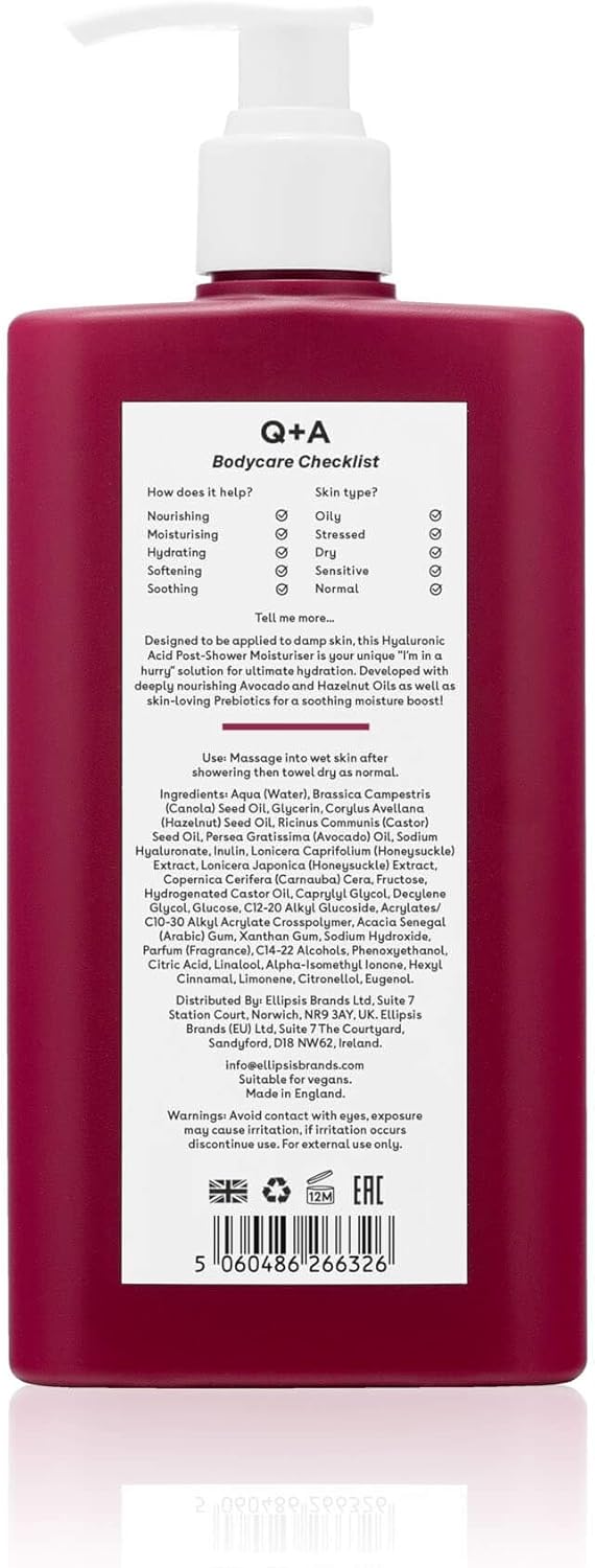 Q+A Hyaluronic Acid Post Shower Moisturiser (250Ml), Wet-Skin Body Lotion With Avocado & Hazelnut Oils, Prebiotic Hydration, Locks In Moisture Quickly, Non-Greasy, Dry Skin Moisturiser
