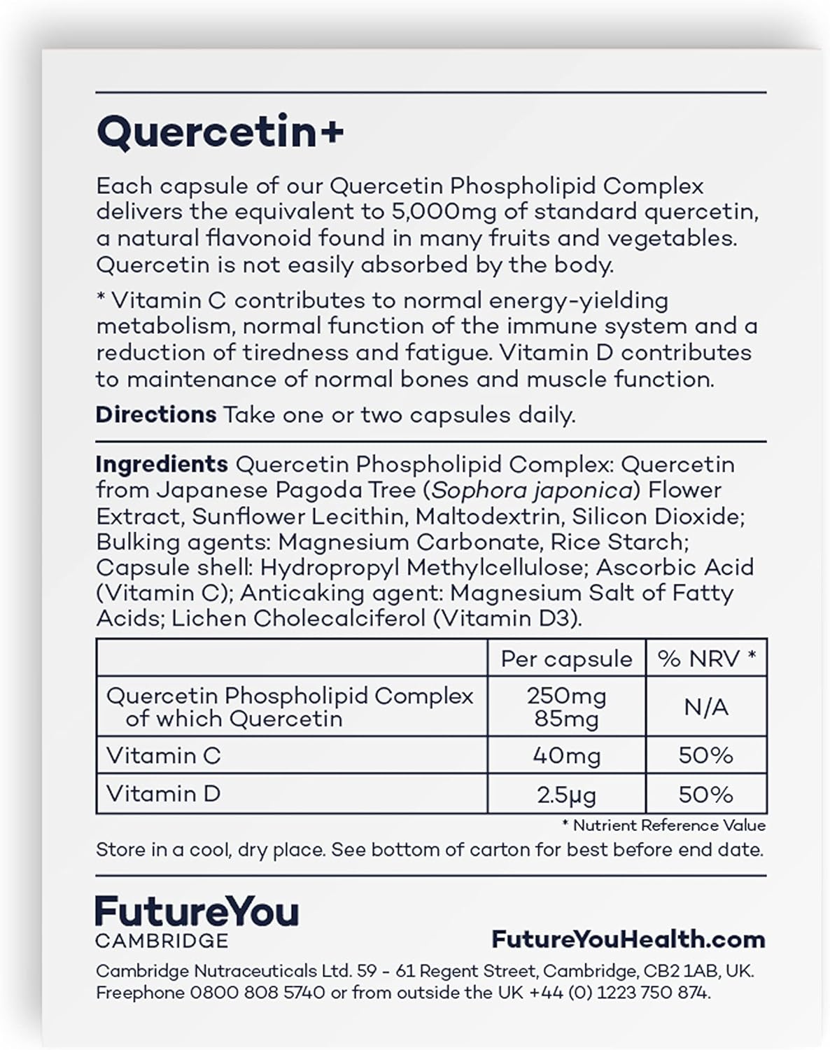 DESCRIPTION : Quercetin+ Quercetin Phospholipid Complex with Vitamins C & D3 - Highly Bioavailable Sunflower Formulation - 28 Day Supply - 28 Vegan Capsules - Developed by FutureYou Cambridge, UK