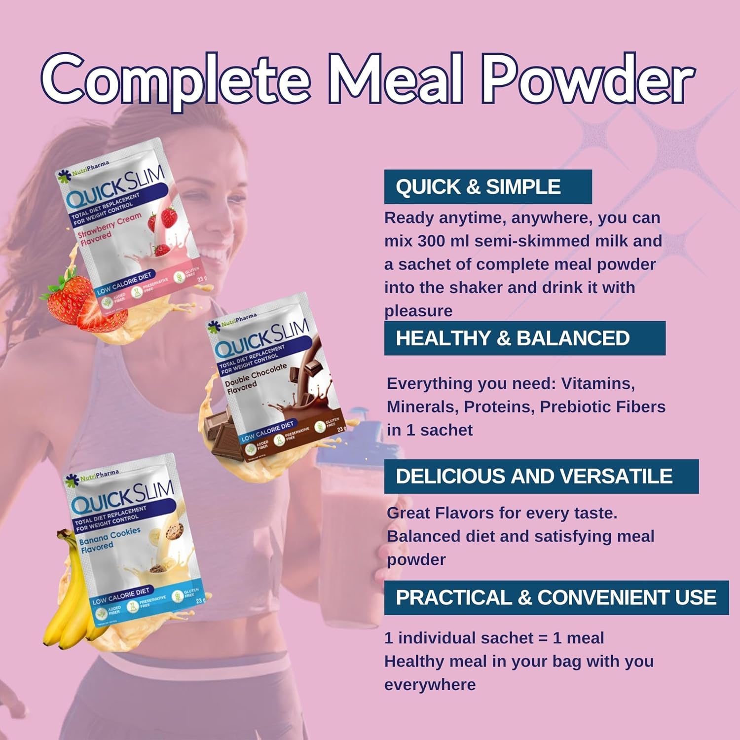 Easy To Prepare: Quick Slim Diet Shakes Consist Of 30 Sachets Delicious Banana Cookies, Double Chocolate, Strawberry Cream Flavored Weight Loss Shakes In 1 Box. It'S Perfect To Take On The Go. Single-Serving Packets (30 Packets In 1 Box) Make This Convenient To Grab-And-Go For Travel, The Office Or The Gym. Slip One Into Your Bag And Enjoy Your Shake At Work Or On The Go. Just Add Skimmed Milk, Shake And Enjoy!