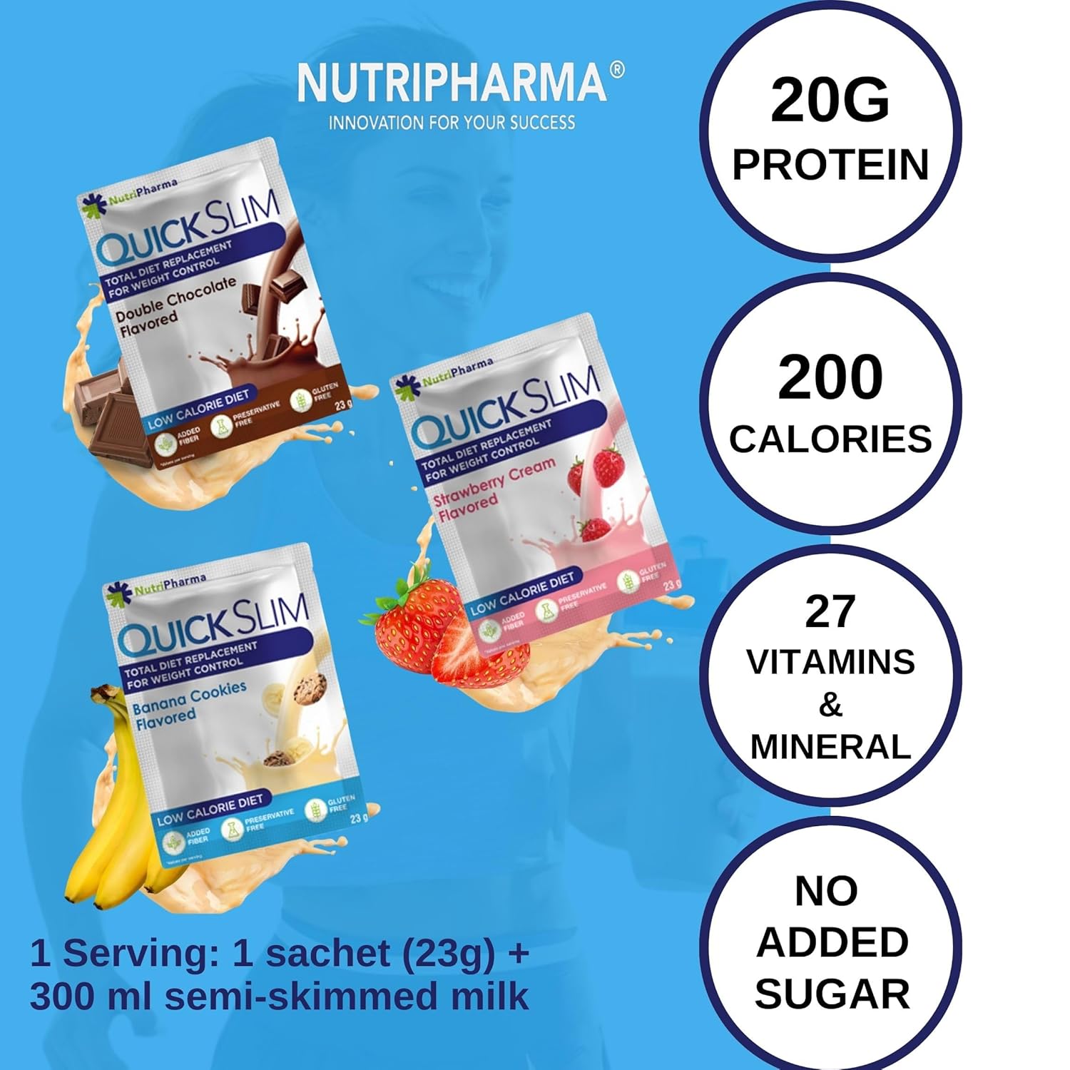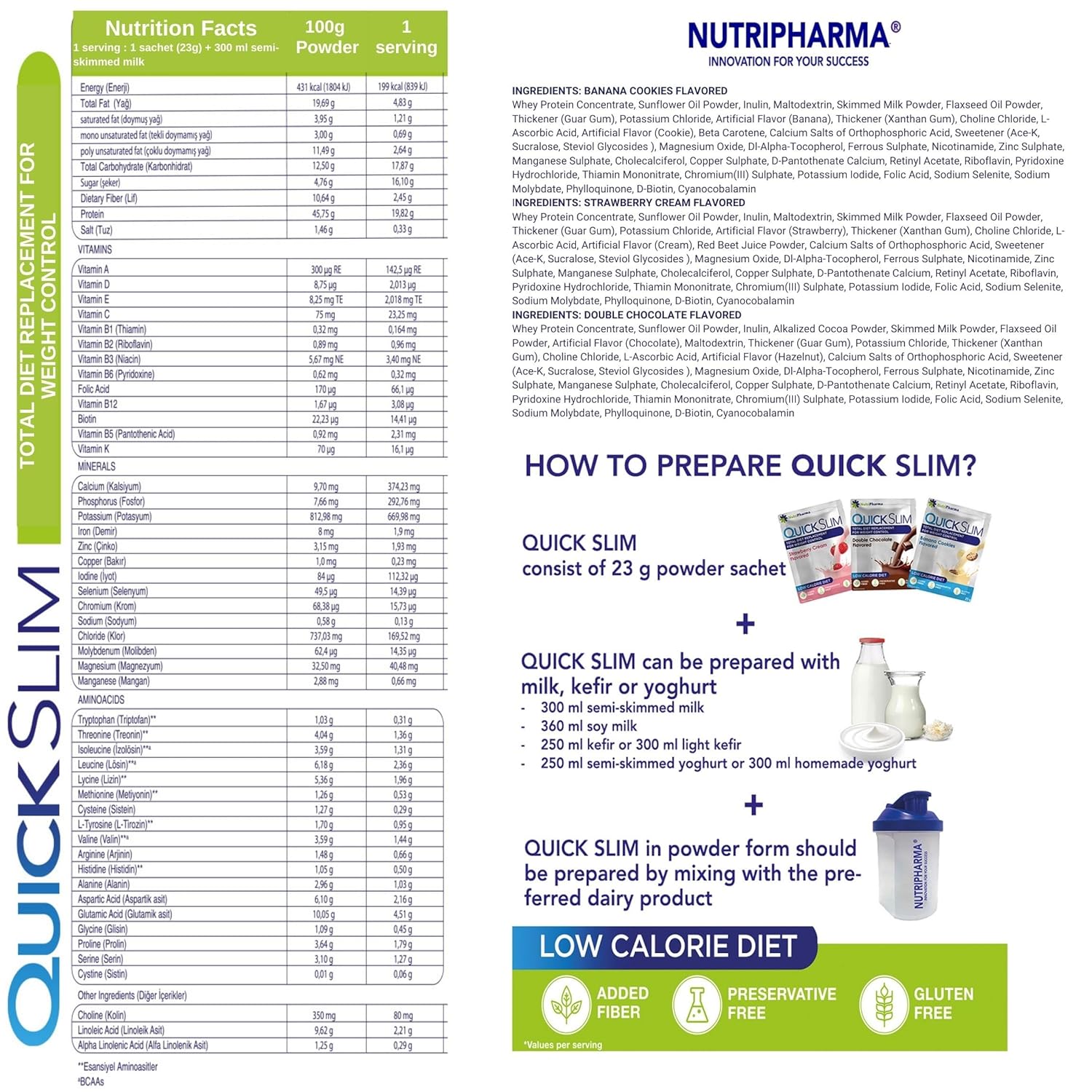 Support Weight Loss Quick Slim Is A Meal Replacement Formula Which Contains Vitamins & Minerals, Whey Protein To Keep Our Body Fit And Active. Quick Slim Keeps Full & Help You Lose Weight In A Enjoyable Way. Strawberry Cream, Banana Cookies And Double Chocolate Flavored Easy To Prepare Quick Slim Diet Shakes Consist Of 3 Delicious Flavors In Single Serving Sachets. It'S Perfect To Take On The Go. Single-Serving Packets (30 Packets In 1 Box) Make This Convenient To Grab-And-Go For Travel, The Office Or The Gym. Slip One Into Your Bag And Enjoy Your Shake At Work Or On The Go. Just Add Skimmed Milk, Shake And Enjoy! Complete Nutrition Quick Slim Meal Replacement Powder Contain 20G Protein, 27 Vitamins & Minerals, Dietary Fiber(Prebiotic) And Essential Nutrients Which Are Your Body Needs Daily. Quick Slim Smoothie Is A Convenient Meal Replacement With 27 Vitamins And Minerals To Nourish Your Body And Support An Active Lifestyle. Ketogenic Shake Powder & Weight Loss & Energy Support. 3 Delicious Flavors In 1 Box Or Single Flavor In 1 Box All Your Favourite Quick Slim Shake Flavours (Double Chocolate, Strawberry Cream And Banana Cookies) In One Box Or Single Flavor In 1 Box. 30 Meal Replacement Sachets. Gluten Free. It Helps You Lose Weight. User Guide For Quick Slim How To Prepare Quick Slim  Quick Slim Consist Of 23 G Powder Sachets. Add 300 Ml Of Cold Semi-Skimmed Milk Into The Shaker. Add 1 Sachet Of Powder To The Milk. Shake Well For Approximately 30 Seconds. Start-Up Program (First 2 Days) The Daily Dose Consists Of 5 Meals Consumed Every 3 Hours. No Other Food Is Consumed. Unsweetened Tea, Coffee And Calorie-Free Drinks Are Free. The Start-Up Program Can Be Extended Up To 8 Weeks. Continuation Program (3Rd Day And After) From Day 3, The Continuation Program Can Be Maintained As Part Of A Diet Containing Meal Replacement For Weight Control. Instead Of 2 Main Meals (Preferably Morning And Evening), 1 Sachet Of Quick Slim Is Used. In The Other Main Meal (Preferably Noon), 500 Kcal For Women And 700 Kcal For Men Should Be Preferred. 3 Snack Meals Not Exceeding 100 Calories Should Be Consumed Between These Meals. 2 Meals A Day With Quick Slim, 1 Main Meal And 3 Snack Meals Per Day Provide About 1200 Kcal For Women And 1400 Kcal For Men. Quick Slim Meal Replacement Shakes For Weight Loss, 30 Servings, Complete Mea... Quick Slim High Protein Shakes For Weight Loss, 30 Servings, Complete Meal Re... Quick Slim Meal Replacement Shake For Weight Loss, 30 Servings, 20G Protein, ... Quick Slim Meal Replacement Shake For Weight Loss, 30 Servings, Complete Meal... Nutripharma Collagen Peptides Powder With Hyaluronic Acid And Vitamin C, Prom... Add To Cart Logshoppablemetrics("Module-5", True) Add To Cart Logshoppablemetrics("Module-5", True) Add To Cart Logshoppablemetrics("Module-5", True) Add To Cart Logshoppablemetrics("Module-5", True) Add To Cart Logshoppablemetrics("Module-5", True) Customer Reviews .Aplus-V2 .Aplus-Review-Right-Padding { Padding-Right: 0.1Rem; } 3.7 Out Of 5 Stars 384 .Aplus-V2 .Aplus-Review-Right-Padding { Padding-Right: 0.1Rem; } 3.7 Out Of 5 Stars 384 .Aplus-V2 .Aplus-Review-Right-Padding { Padding-Right: 0.1Rem; } 3.7 Out Of 5 Stars 384 .Aplus-V2 .Aplus-Review-Right-Padding { Padding-Right: 0.1Rem; } 3.7 Out Of 5 Stars 384 .Aplus-V2 .Aplus-Review-Right-Padding { Padding-Right: 0.1Rem; } 4.6 Out Of 5 Stars 30 Price $59.99 $ 59 . 99 $59.99 $ 59 . 99 $59.99 $ 59 . 99 $59.99 $ 59 . 99 $39.99 $ 39 . 99 Flavor Variety Pack Banana Cookies Double Chocolate Strawberry Cream Unflavored Protein Per Serving 20G Protein 20G Protein 20G Protein 20G Protein 9G Protein Ingredients Whey Protein Concentrate, 27 Vitamin&Mineral, Dietary Fiber Whey Protein Concentrate, 27 Vitamin&Mineral, Dietary Fiber Whey Protein Concentrate, 27 Vitamin&Mineral, Dietary Fiber Whey Protein Concentrate, 27 Vitamin&Mineral, Dietary Fiber Collagen Peptides Powder, Hyaluronic Acid, Vitamin C Benefits Weight Loss, Detoxing, Nutritional Support Weight Loss, Detoxing, Nutritional Support Weight Loss, Detoxing, Nutritional Support Weight Loss, Detoxing, Nutritional Support Skin, Hair, Nail And Joint Support Keto & Paleo Friendly      Gluten Free