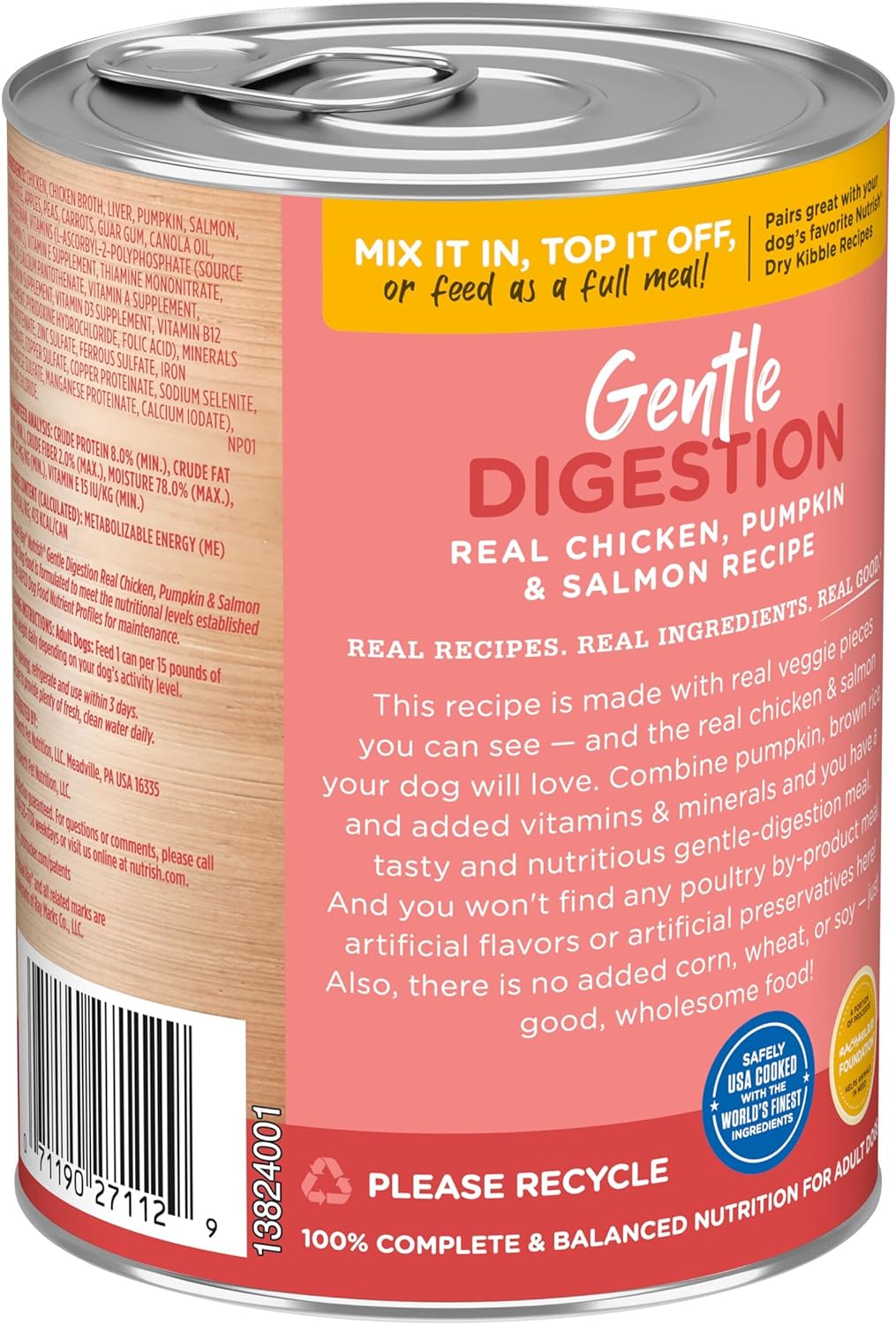 Help Your Dog Feel Their Very Best With Rachael Ray Nutrish Gentle Digestion Real Chicken, Pumpkin & Salmon Recipe Wet Dog Food. This Premium PatĆ© Dog Food Is Made With Real Chicken, Real Salmon And Real Veggies Pieces You Can See. Combined With Pumpkin, Brown Rice And Added Vitamins And Minerals, You Get A Tasty, Complete And Balanced Meal For Adult Dogs That Helps Promote Healthy Digestion. It Pairs Great With Your DogāS Favorite Nutrish Dry Kibble Recipes. Mix It In, Top It Off Or Feed As A Full Meal. ThereāS No Artificial Flavors Or Artificial Preservatives In This RecipeāNo Added Corn, Wheat, Soy Or Gluten, Either. Just Good, Wholesome Food Inspired By The Heart Of RachaelāS Kitchen
