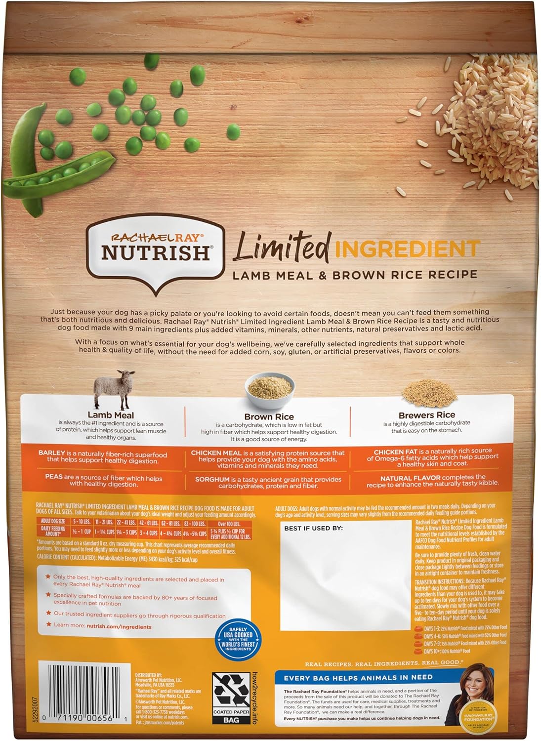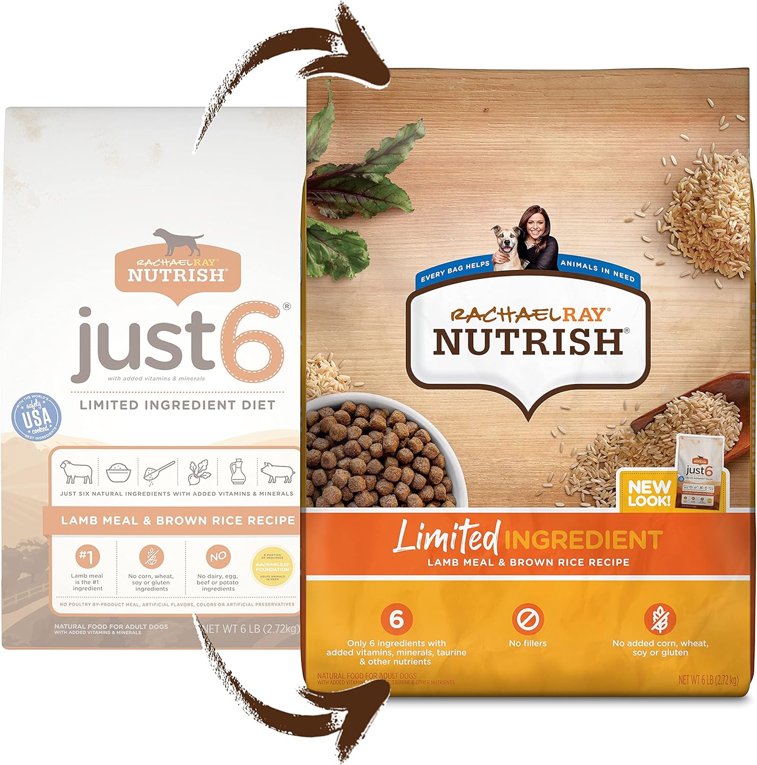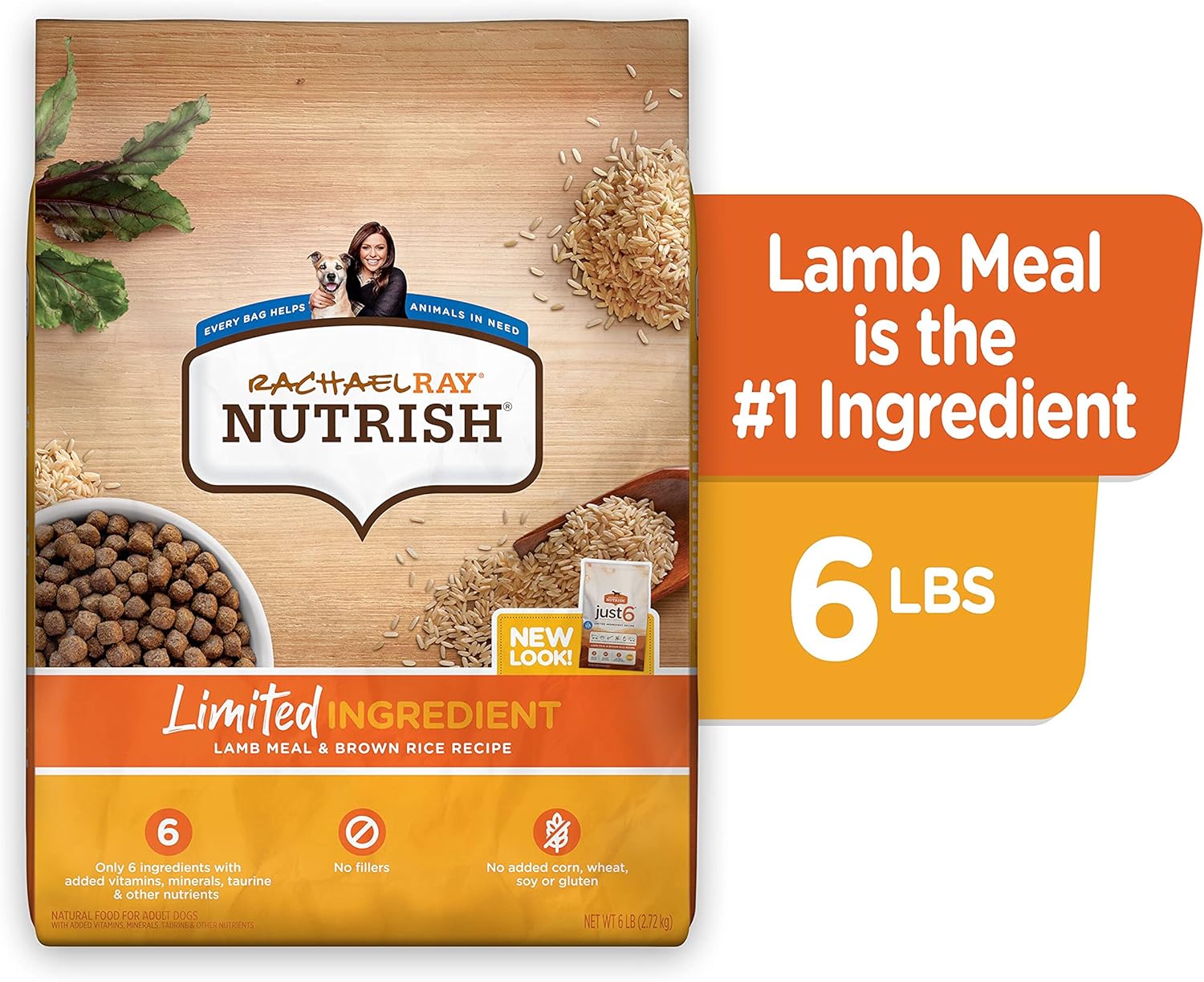 Contains one (1) 6 pound bag of Rachael Ray Nutrish Limited Ingredient Lamb Meal & Brown Rice Recipe dry dog food (packaging design may vary)