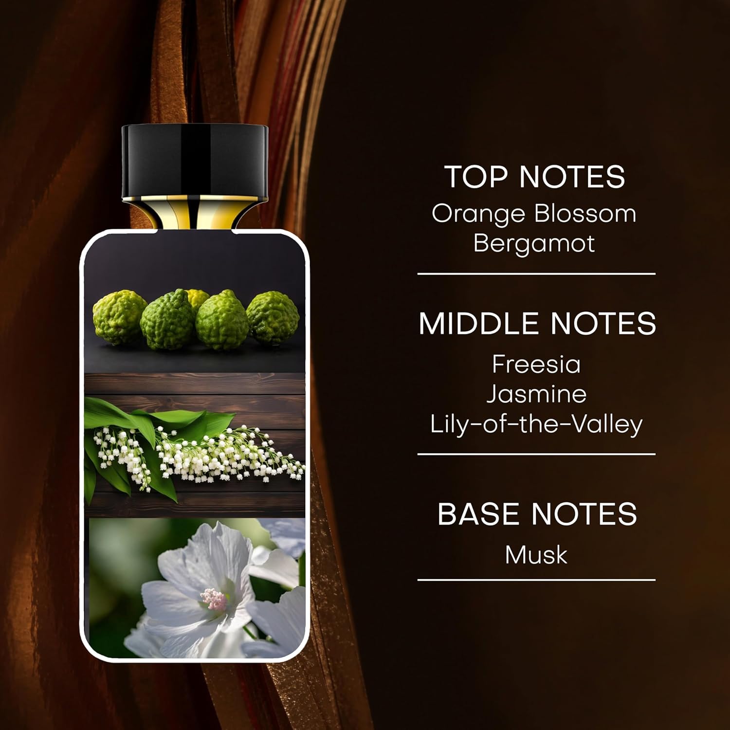 CAPTIVATING FLORAL MUSK SCENT. Immerse yourself in this sophisticated, long-lasting floral musk perfume, with top notes of bergamot and orange blossom, middle notes of jasmine, freesia, and lily of the valley, and bottom notes of musk