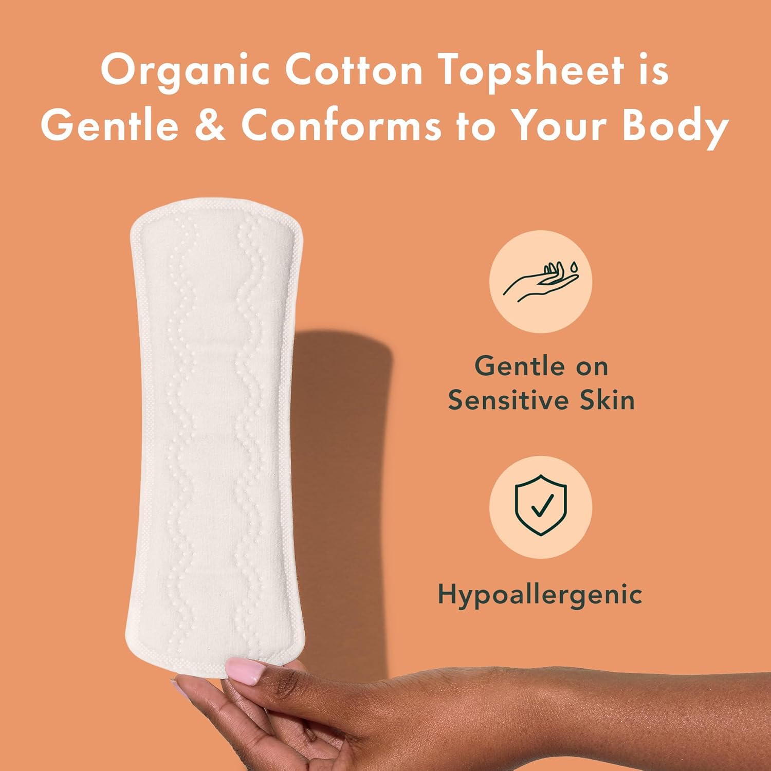 About this item EXTRA-LONG DESIGN - An extra 4 centimeters of length provides maximum security and leak-free coverage. 100% CERTIFIED ORGANIC COTTON COVER - Made with certified organic cotton grown without the use of toxins, pesticides or synthetic chemicals. Ultra-soft and super absorbent to keep you feeling fresh and comfortable all day long. ULTRA THIN DESIGN - Engineered to move comfortably with your body, offering protection where you need it most. Discreet enough for everyday wear. MAXIMUM AIR FLOW - Made with hypoallergenic, soft, and breathable materials to alleviate unpleasant odors and irritation. MADE FOR ALL PEOPLE WHO BLEED - Products designed with clean ingredients that are safe and suitable for all skin types and menstrual conditions. UPGRADED ADHESIVE - New and improved adhesive to help keep your liners stay in place coming soon. See more product details,EXTRA-LONG DESIGN - An extra 4 centimeters of length provides maximum security and leak-free coverage,100% CERTIFIED ORGANIC COTTON COVER - Made with certified organic cotton grown without the use of toxins, pesticides or synthetic chemicals. Ultra-soft and super absorbent to keep you feeling fresh and comfortable all day long,ULTRA THIN DESIGN - Engineered to move comfortably with your body, offering protection where you need it most. Discreet enough for everyday wear,MAXIMUM AIR FLOW - Made with hypoallergenic, soft, and breathable materials to alleviate unpleasant odors and irritation,MADE FOR ALL PEOPLE WHO BLEED - Products designed with clean ingredients that are safe and suitable for all skin types and menstrual conditions,UPGRADED ADHESIVE - New and improved adhesive to help keep your liners stay in place coming soon